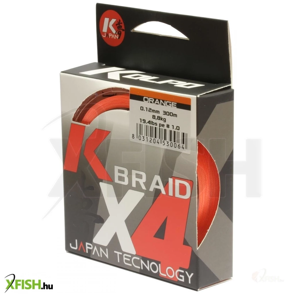 Kolpo KX4 fonott zsinór narancssárga színben. A K-Braid a Kolpo egyik kiváló minőségű fonott zsinór családja, amelyet magas minőségi szabványok alapján készítettek el. A K-Braid zsinórok 4X fonata rendkívül lágy, jól köthető, speciális bevonatnak köszönhetően nagy kopásállóságú, kiváló tartású és nehezen gubancolódik. Kiváló és sokoldalú zsinór melyet használhatunk feeder, pergető, match horgászatra, illetve köthetünk belőle bojlis előkét, vagy monofiles pergetéshez előkét. Legyen szó ponty, pisztráng és sügér, vagy a nagyobb csuka-horgászatáról a KX4 K-Braid erejére és megbízható minőségére mindig számíthat. A KX4 K-Braid 4x fonott zsinór több tucat PE mikroszálból van összefonva, melyek további 4-es kötegeket alkotnak. A finom, vékony, erős mono szálaknak köszönhetően sokkal nagyobb a teherbíró képessége a zsinórnak. A K-Braid precíziós alapanyag-gyártásai és fonási eljárása biztosítja, hogy rendkívüli erőt fejthessen ki, míg a kör keresztmetszetet és a teljes hosszban azonos vastagság egyenletes minőséget biztosít használójának. A fonott zsinór nem nyúlik, ezért minden apró rezzenést továbbít botunk felé ezért azonnal reagálhatunk a kapásra. A K-Braid fonott zsinór felületén egy speciális vékony bevonatot kapott, ezért sokkal ellenállóbb és kopásállóbb a zsinór. A bevonat másik előnye az, hogy a nedvszívó képessége minimális. A zsinór színe ideálissá teszi bármely vízre. 5 méretben, 300m és 150m-es kiszerelésben kapható. A zsinór festésekor speciális vegyi kezelést is kapott, hogy a nap ne tudja megváltoztatni a színét. A 150m illetve 300m zsinór mellé nem kell előke kötéshez plusz zsinórt venni hiszen 120-140m bőven elegendő egy orsóra pergetéshez, illetve fenekezésre is a legtöbb esetben (ha nem elég akkor ott a 300m-es kiszerelés) így is marad 10-20m zsinór melyből köthetünk előkéket. Használhatjuk pergetni, fenekezni vagy akár akadóban történő úszózáshoz is a vékonyabb méreteket. Az előke használata ideális olyan vizeken, ahol nem hagyhatjuk a halat kontroll nélkül, ahol számít az azonnali bevágás.