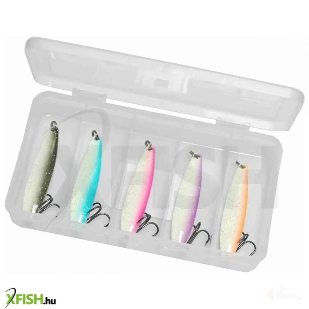 A szett tartalma, 1db villantó tároló doboz, 5db támolygó villantó, színenként 1 db - súlya 13 gramm - hossz 6,5 centiméter