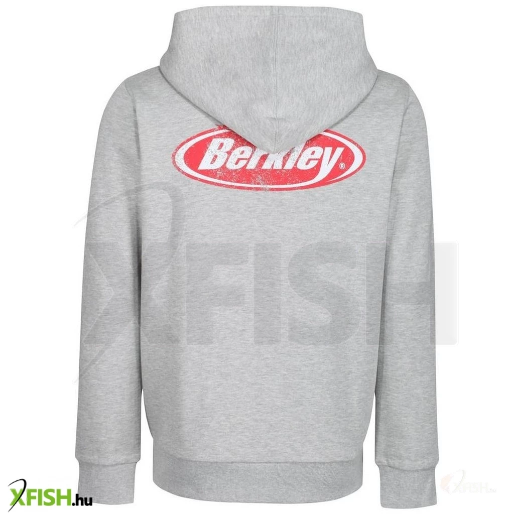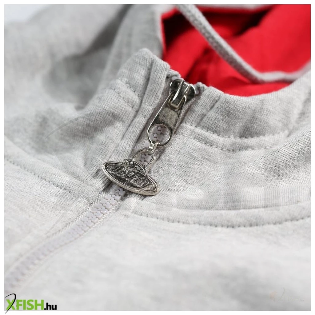 Szürke Berkley cipzáras, kapucnis pulóver 2 elülső zsebbel, Berkley logoval a mellkason és hátul. Belső része piros.