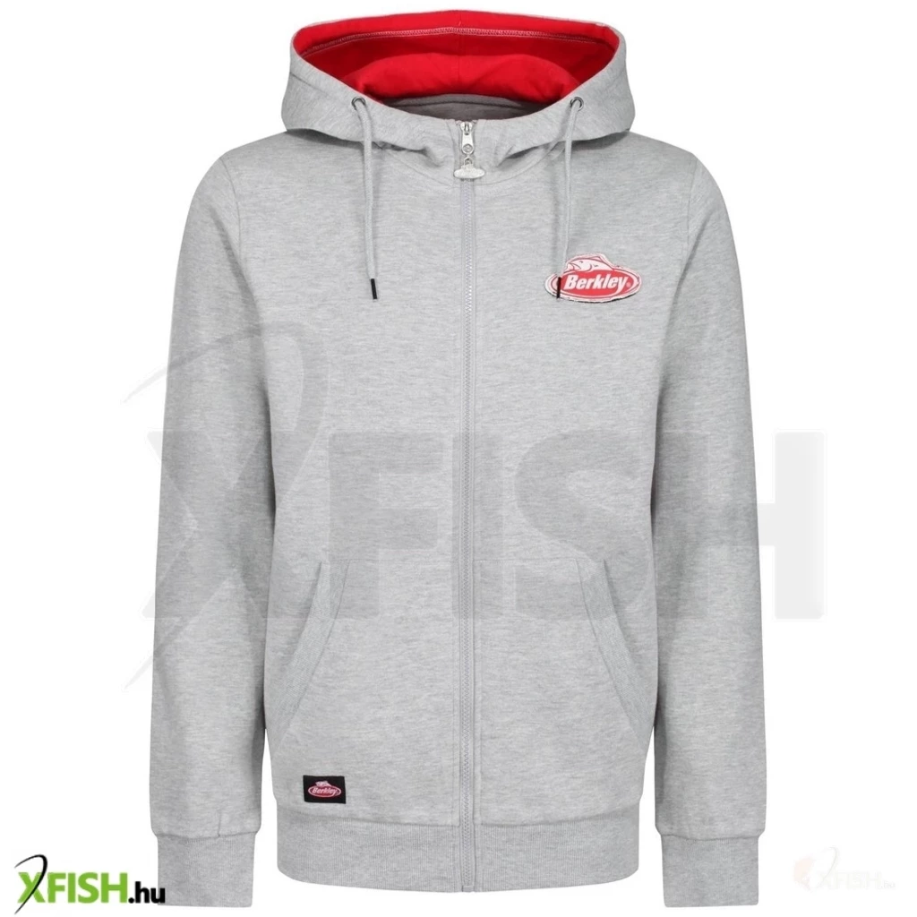 Szürke Berkley cipzáras, kapucnis pulóver 2 elülső zsebbel, Berkley logoval a mellkason és hátul. Belső része piros.