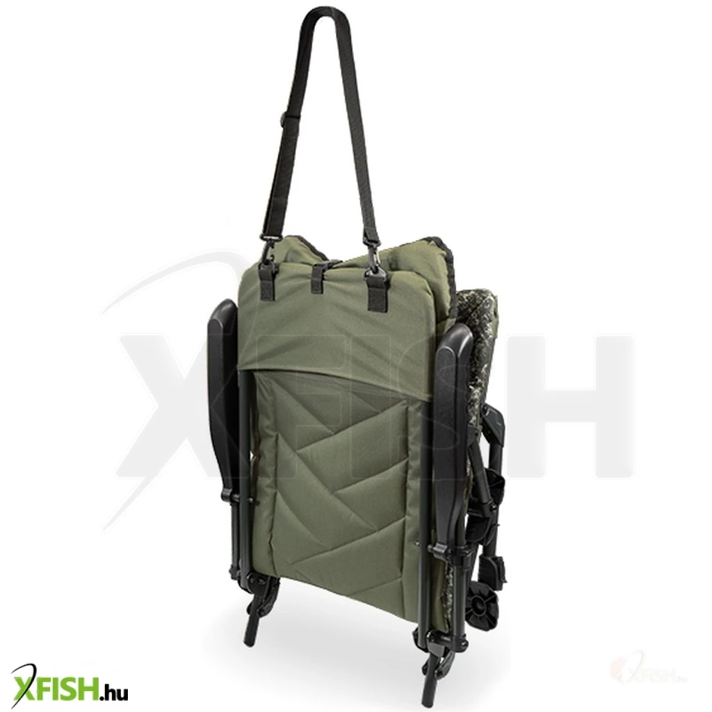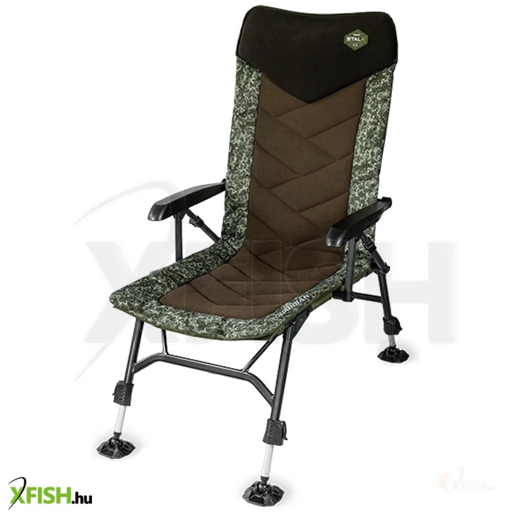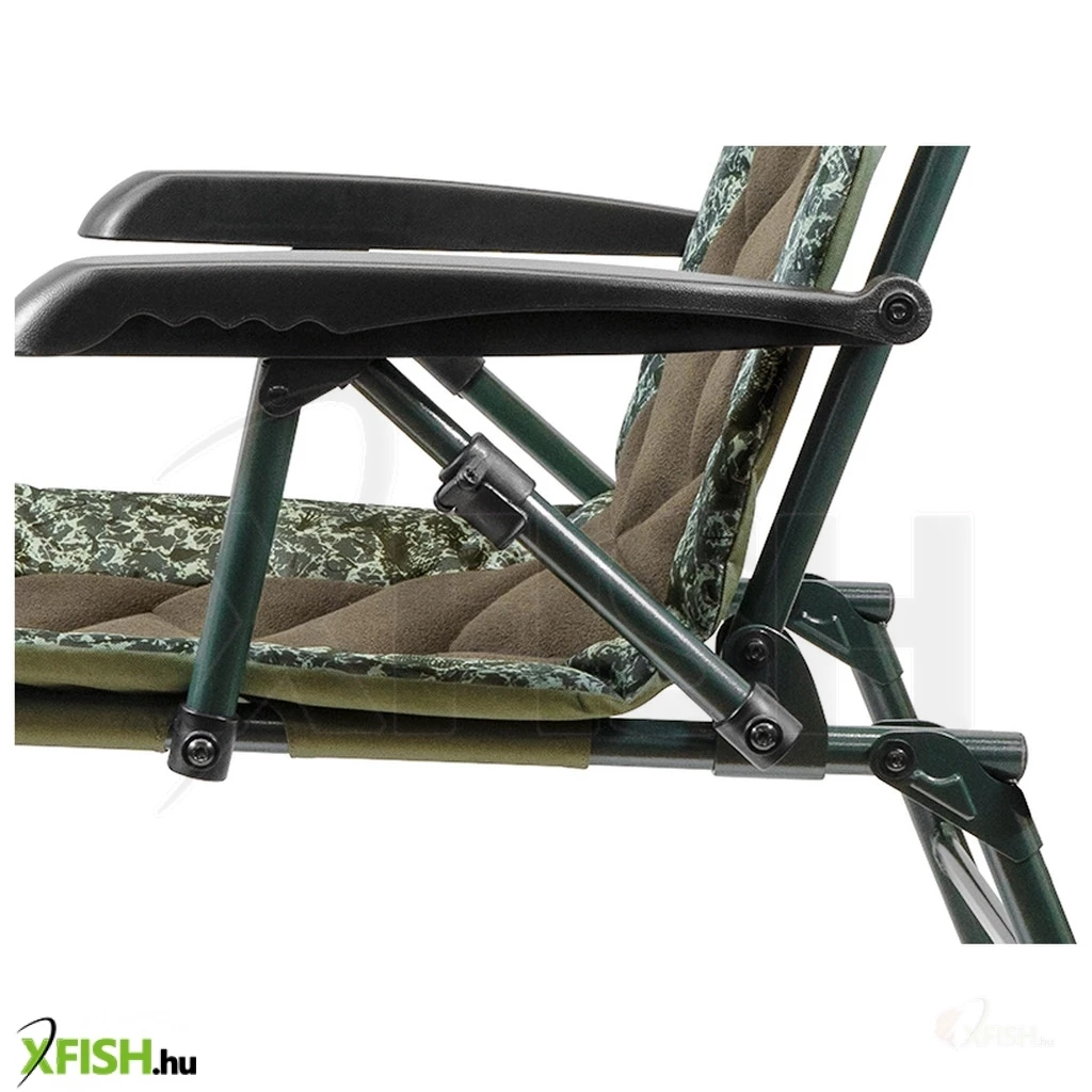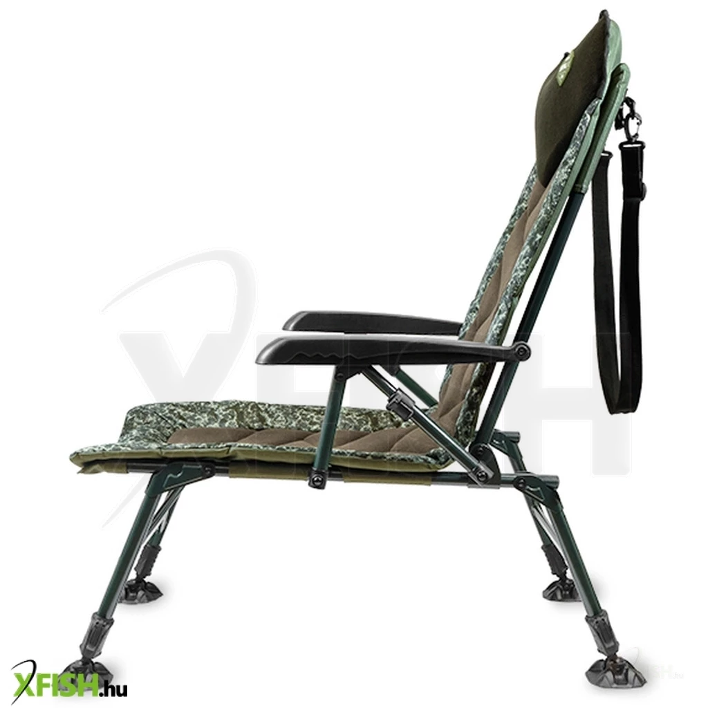 Az állítható magasságú lábak robusztus sártappancsokkal felszereltek, így bármilyen egyenetlen terepen megállják a helyüket, megakadályozva a szék süllyedését puha talajon. A karfák nemcsak a kényelemhez járulnak hozzá, hanem segítségükkel a háttámla könnyedén állítható, megóvva a horgászt attól, hogy fel kelljen állnia a székből.