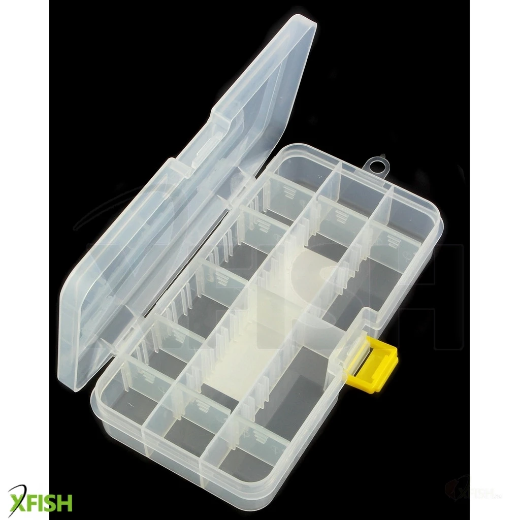 Háromsoros, átlátszó szerelékes doboz. Az osztások tetszés szerint variálhatóak. Akasztófüllel, erősített zárócsattal. Ha szeretné aprócikkeit, műcsalijait, etetőkosarait rendezetten tárolni, ez a doboz remek választás.