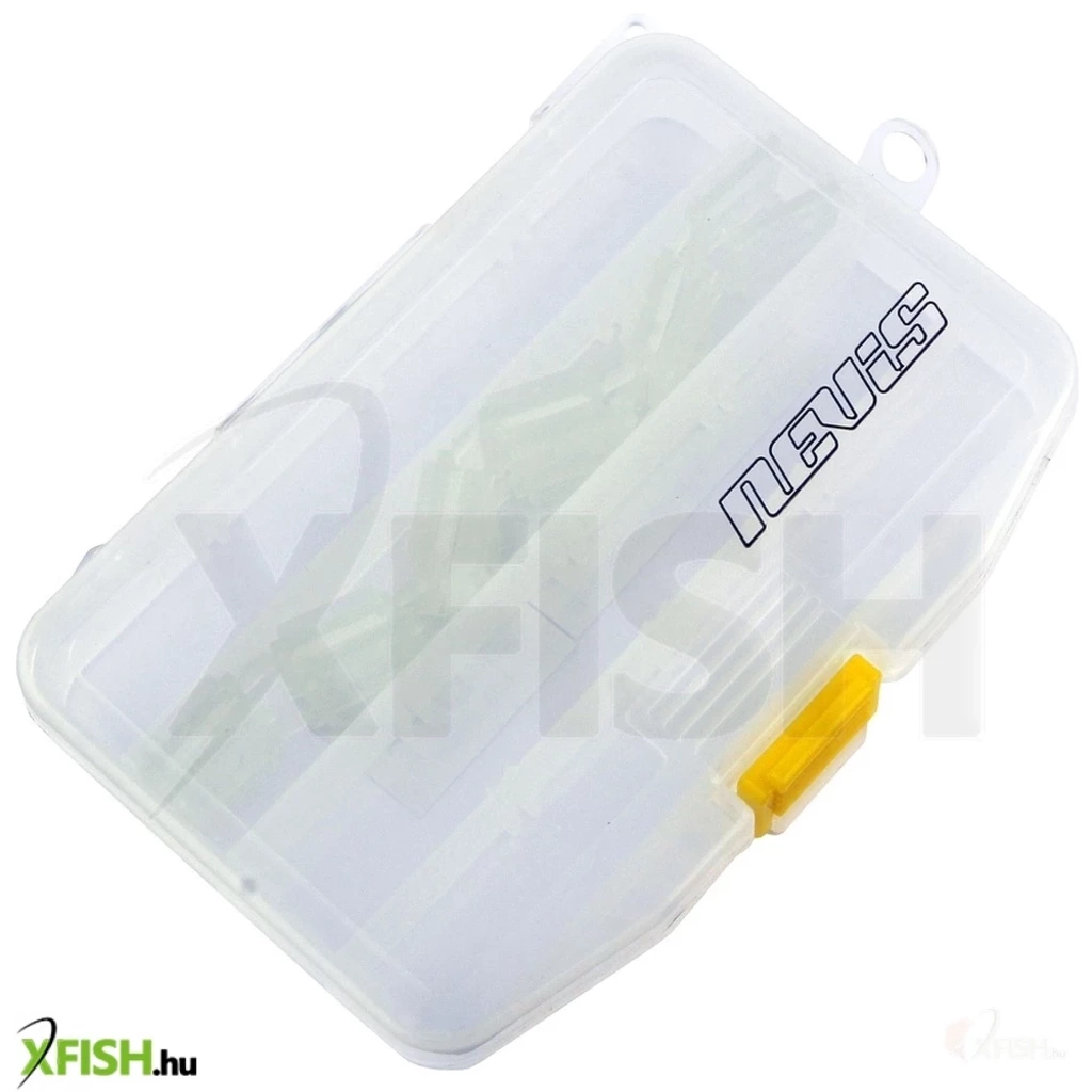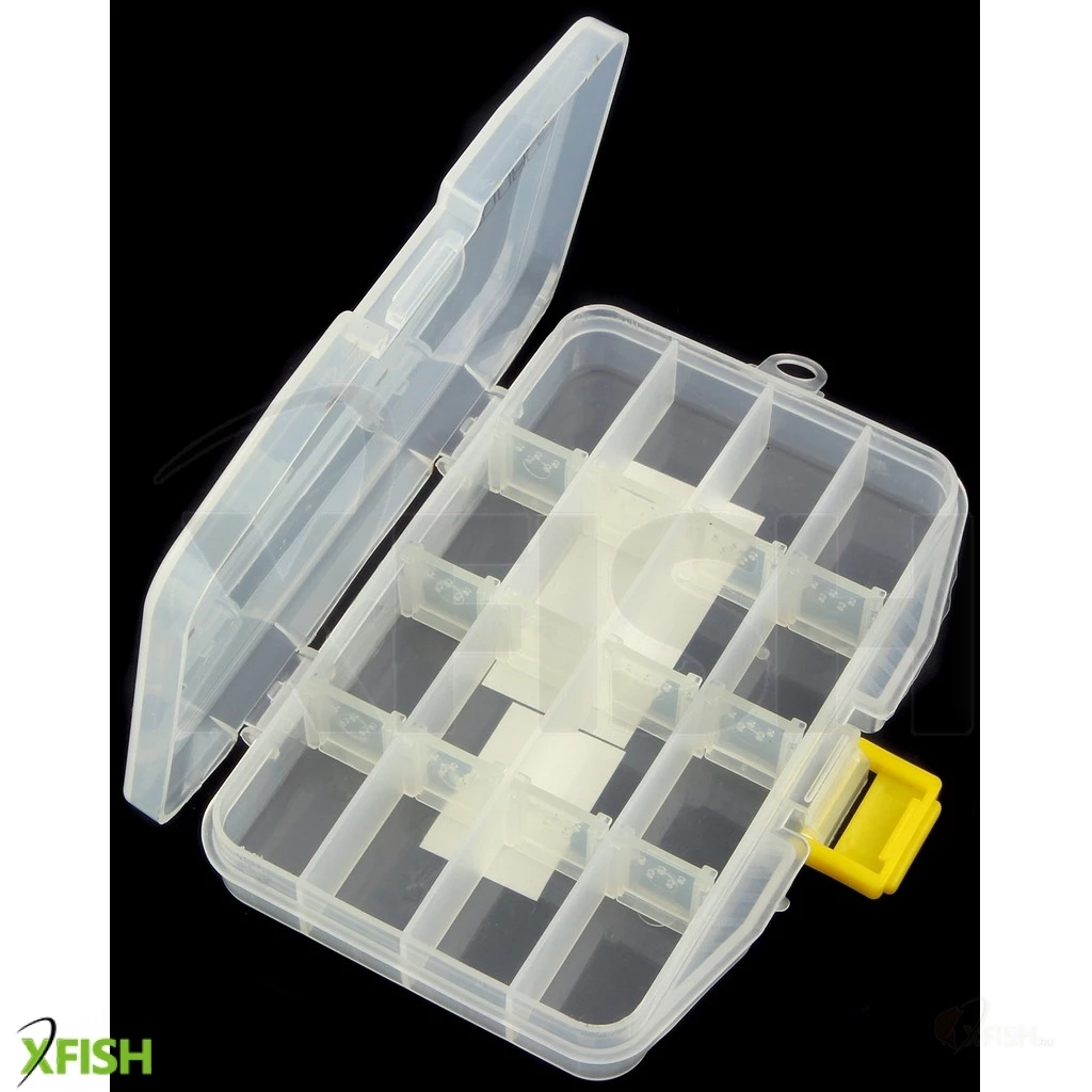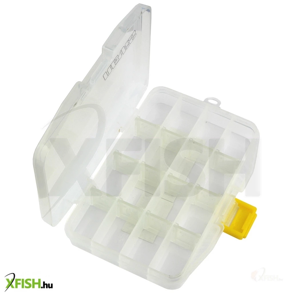 Négysoros, átlátszó szerelékes doboz. Az osztások tetszés szerint variálhatóak. Akasztófüllel, erősített zárócsattal.Ha szeretné aprócikkeit, műcsalijait, etetőkosarait rendezetten tárolni, ez a doboz remek választás.