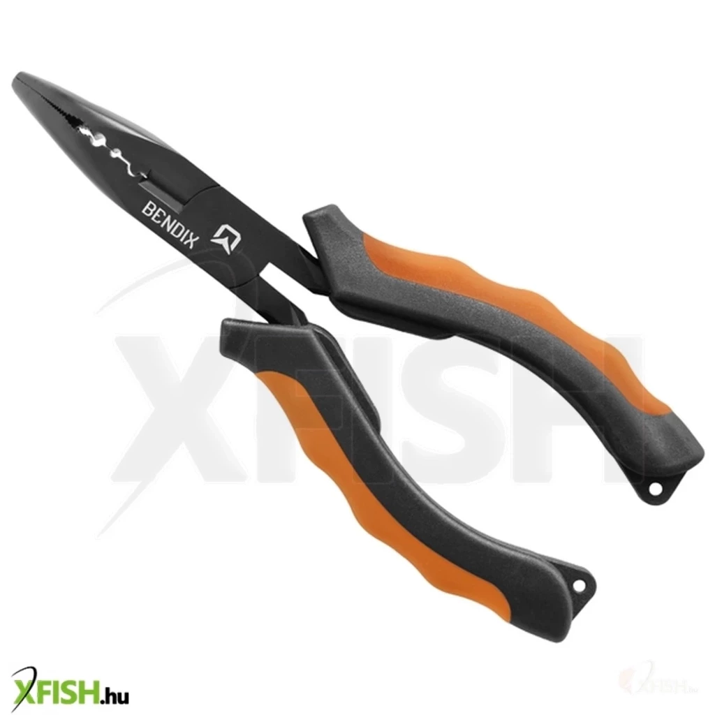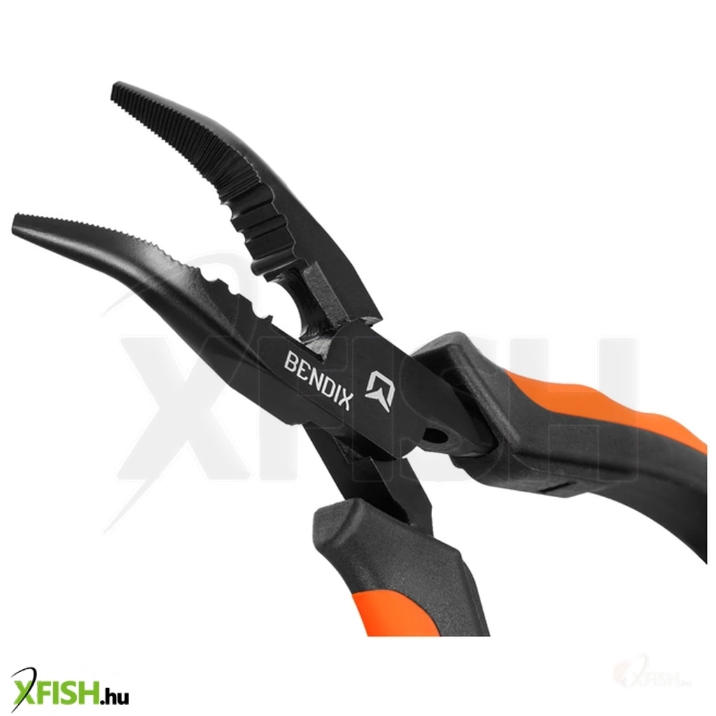 A Delphin BENDIX hajlított multifunkciós fogó alkalmas a ragadozóhalak szájában mélyre került horgok kiszabadítására. A fogó maga 16 cm hosszú. Belső felülete úgy van kialakítva, hogy remekül meg tudja szorítani még a nagyobb méretű dupla vagy hármas horgokat is. Ezenkívül acél és wolfram zsinórok vágására is alkalmas és krimpelő résszel is fel van szerelve az egyszerű és kettős krimpeléshez egyaránt. Magas széntartalmú acélból készül, és mindkét fogantyú narancssárga-fekete színű, hogy mindig könnyen megtalálható legyen a felszerelésében. Mindkét fogantyú rendelkezik egy hurokkal, amibe madzag köthető. A BENDIX fogóval minden helyzetre fel lesz készülve, amikor ragadozóhalakra horgászik!
