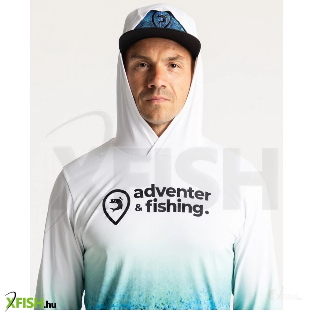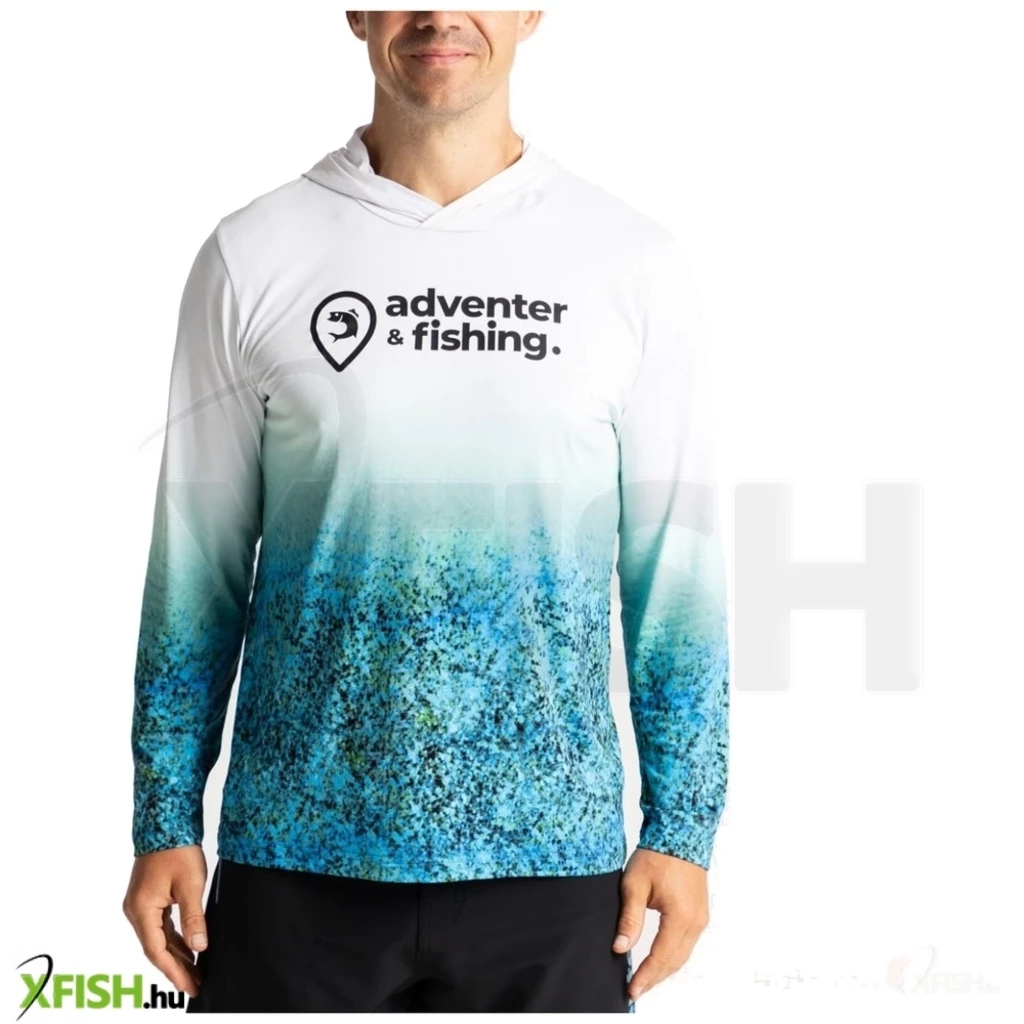 Hosszú ujjú kapucnis UV póló Bluefin Trevally témában, az Adventer & Fishing márka kék-fehér színében.