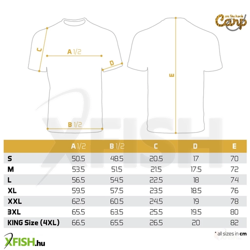 Maga a póló kiváló minőségű, akárcsak a rajta lévő színes nyomat. Széles méretválasztékban kínáljuk az S-től a KING SIZE-ig (4+XL-nek felel meg, amit a legtöbb országban XXXXXL-nek neveznek). A King size méretű modell még a legnagyobb horgászok számára is megfelelő, akik akár 135 kg-nál is nehezebbek.