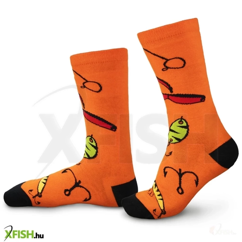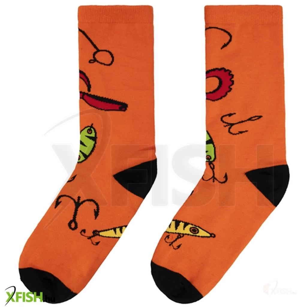 A narancssárga ATAK zokni egyetlen horgászt sem fog hidegen hagyni. Ez elsősorban a rajtuk ábrázolt motívumnak köszönhető. Csalik, jigek, horgok, pontosan ezek azok a termékek, amik egy igazi ragadozóhal horgásznál mindig kéznél van, vagy jelen esetben a lábán :)
