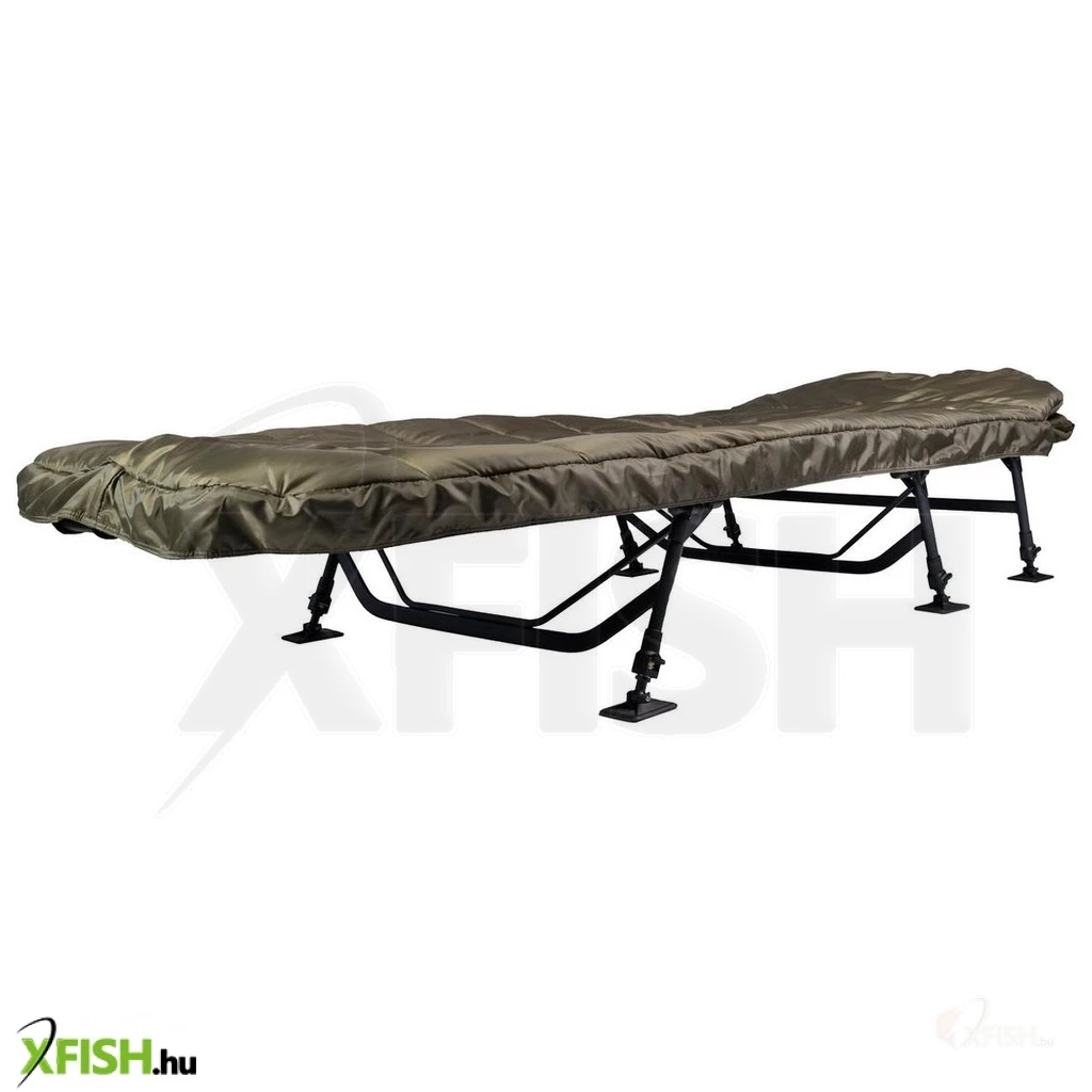 Az ágy egy kényelmes, párnázott polár matraccal van ellátva, ami optimális komfortot nyújt a pihenéshez. A strapabírást egy erős, 6 lábú acél váz garantálja, amely stabil tartást biztosít egyenetlen talajon is. A lábak kihúzhatóak, így az ágy magassága igény szerint változtatható, míg a sárálló lábak növelik a stabilitást sáros területeken is.