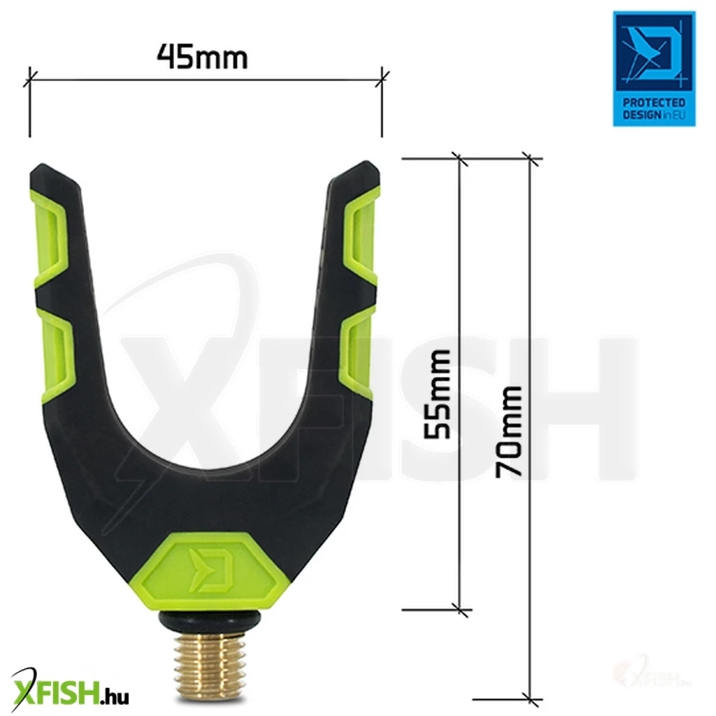 A Delphin Reaxe innovatív feeder sorozatunk színeiben tervezett „U” alakú alapbottartó. Nagyon részletesen kidolgozott, erős és tartós. Az „U” forma lehetővé teszi a különböző nyélátmérőjű botok használatát. Felülete gumírozott anyaggal van bevonva, amely megvédi a botokat a sérülésektől. Ez a bottartó erős anyagokból készül, így nem sérül vagy karcolódik meg könnyen. Univerzális menettel rendelkezik, amely kompatibilis az összes szabvány karral, tartóval és leszúróval. A tartó szárán lévő gumis rész megakadályozza annak elfordulását.
