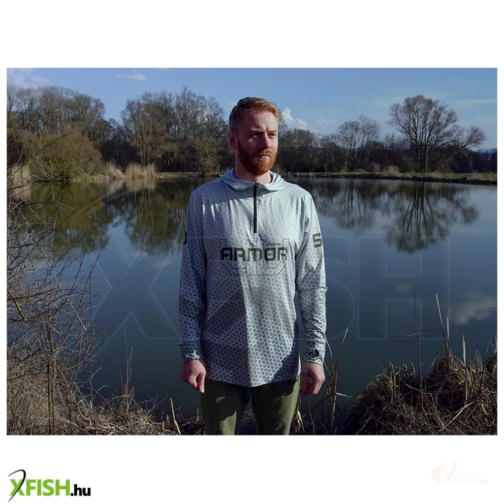Tekintettel arra, hogy a fejünk nagyon gyorsan túlmelegedhet, a pulóver magas gallérral és kapucnival rendelkezik. Ráadásul az ujjai extra hosszúak, és hüvelykujj bujttatóval rendelkeznek, hogy a kezét is megvédje. Puha elasztikus anyagból készül, amely gyorsan szárad, ha horgászat közben elázna.