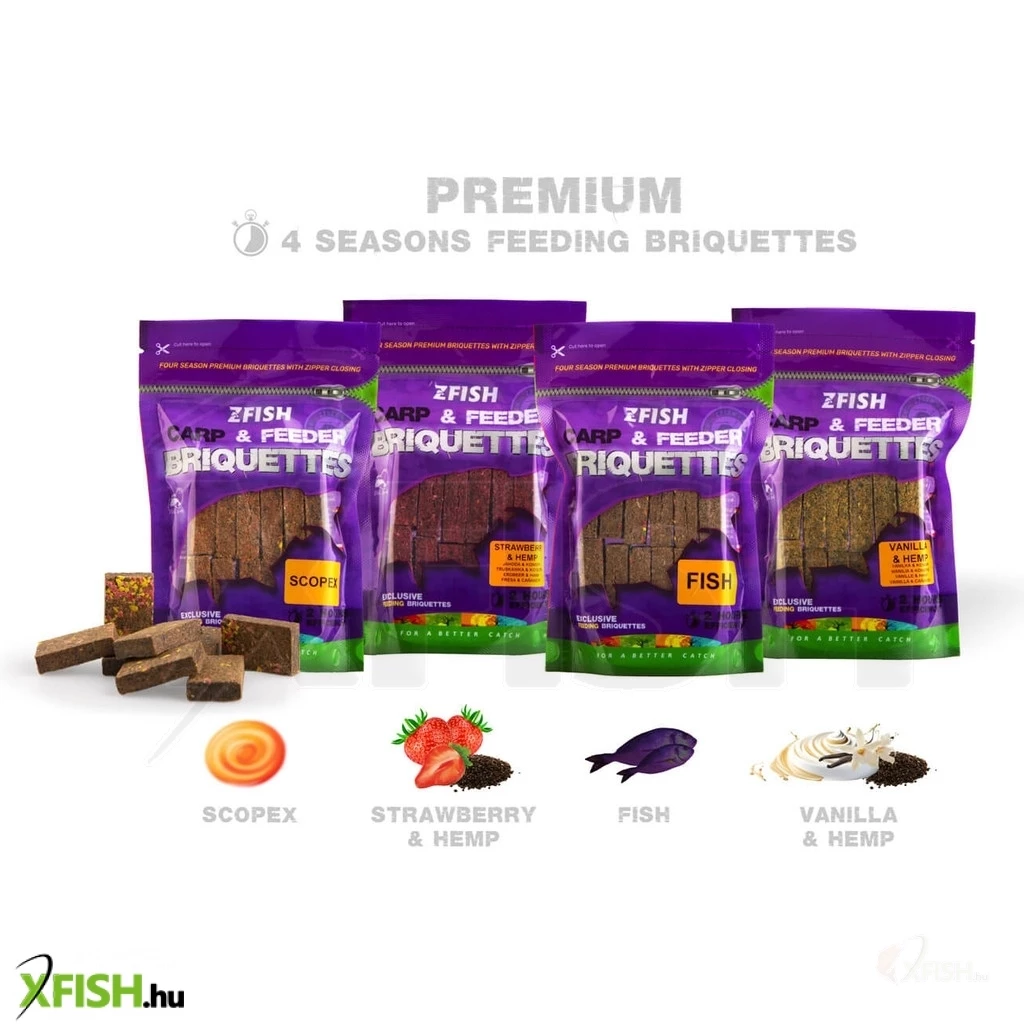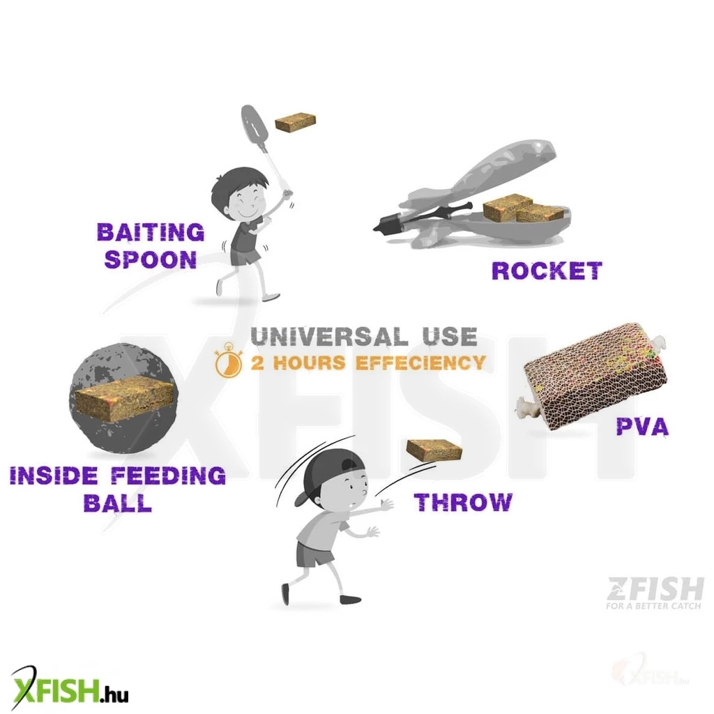 A ZFISH brikettek etetési programunk újdonságai. Nagyon jó minőségű, préselt, takarmánykeverékkel és angol pelyhes kis szemcse, kis tömb (brikett) formában. Ezeknek a "briketteknek" óriási előnye a valóban fokozatos és lassú oldódásuk, valamint az oldott takarmány sűrű és hosszantartó csalogató hatása. Ezeknek a briketteknek a használata nagyon egyszerű és univerzális, és egész évben használhatók, hideg és meleg vízben egyaránt. Nagyon könnyű etetni vagy feltölteni velük, és így sok szempontból vonzóbbá tenni vadászhelyét. A legegyszerűbb természetesen kézzel dobni a brikettet, vagy csúzlival lövöldözni, de PVA termékekben gond nélkül használható, vagy például kicsit "összetörve" más hozzávalóként hozzáadva. a takarmánykeverékedet.