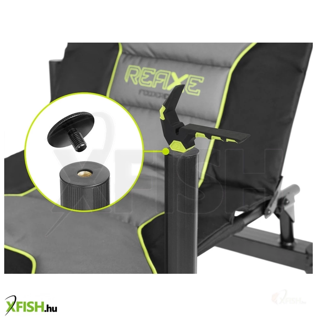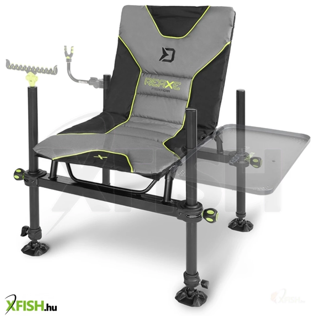 A kényelem ezúttal is kiemelkedő figyelmet kapott, az ülőfelület puhán párnázott a hosszú horgásztúrák során is kényelmes használat érdekében. A szürke-fekete színvilágot az életteli zöld elemek teszik igazán stílusossá, a REAXE sorozat jellegzetes megjelenésével. A Delphin Reaxe Profi Feeder Szék a ProfixARM feeder karokkal, FlatWORX asztallal és más, ugyanolyan menetátmérőjű tartókkal kompatibilis, így a funkcionalitás minden aspektusát kielégíti.