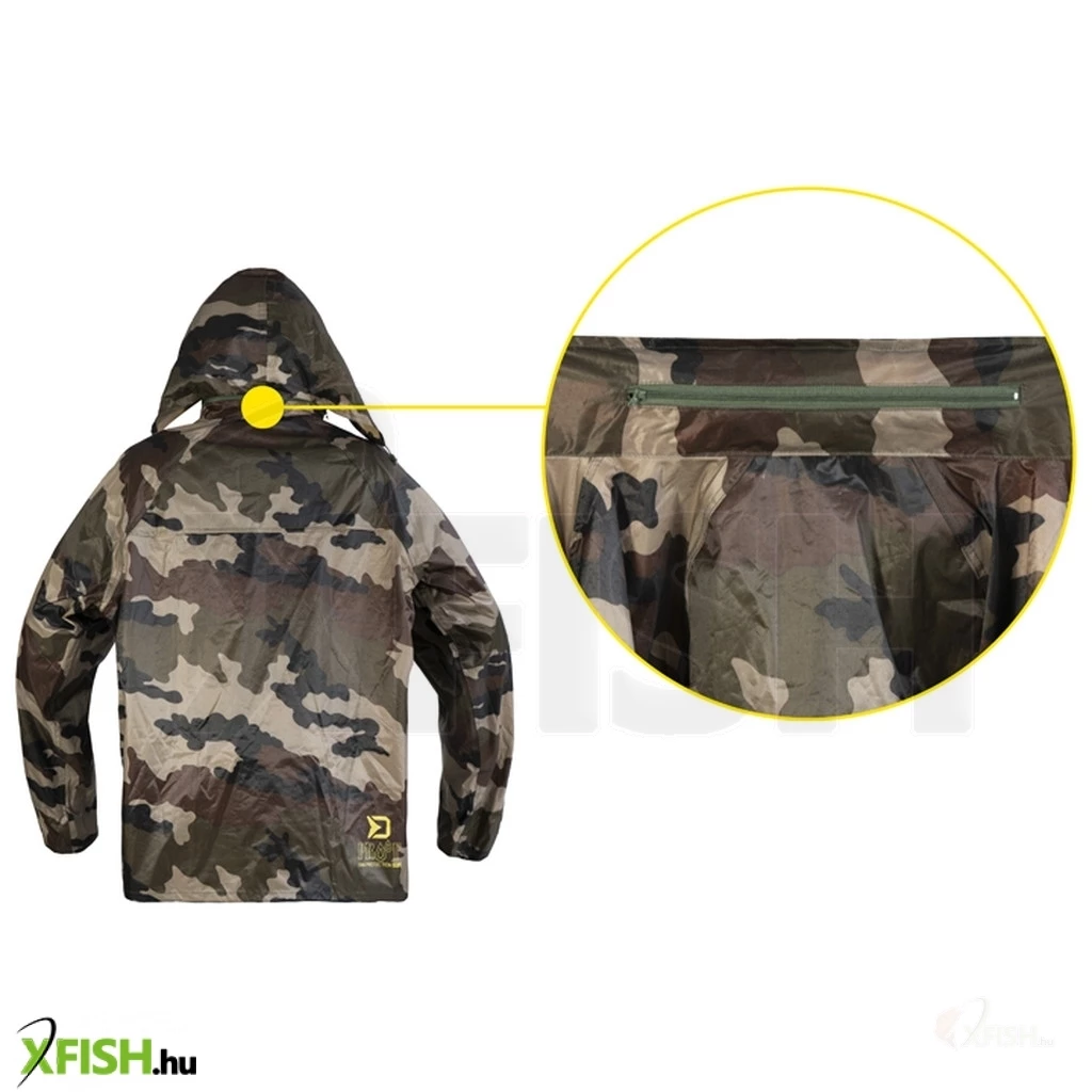 Esős napokra itt a vízálló Delphin PROOF esőruha, amely tökéletesen megvédi viselőjét a rossz időjárástól és meg fogja lepni kompakt szállítási méreteivel. Vízálló, gumírozott anyagból készül, ragasztott varrással és terepmintával.