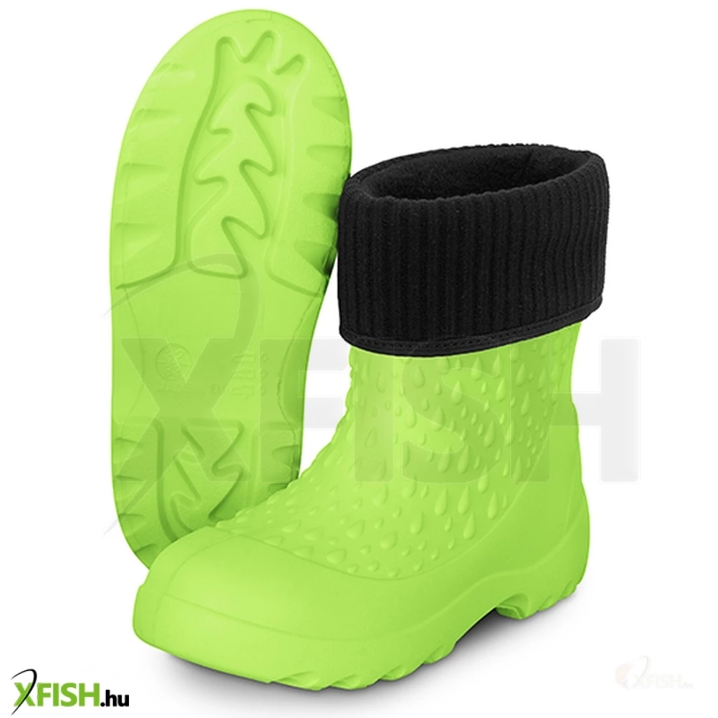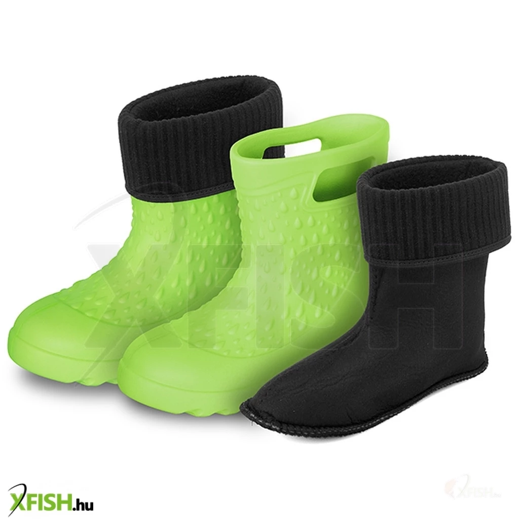 Meleg bélése eltávolítható, így a csizma minden évszakban használható. EVA habból készül a puhaság és rugalmasság érdekében. A felső részen bevágások találhatók, hogy kényelmesebben felvehető legyen. A talp kiváló tapadású, amely csökkenti a nedves vagy egyenetlen terepen való elesés esélyét. Ezek a csizmák semleges zöld színben és sok méretben kaphatók, így fiúknak és lányoknak egyaránt ajánljuk.