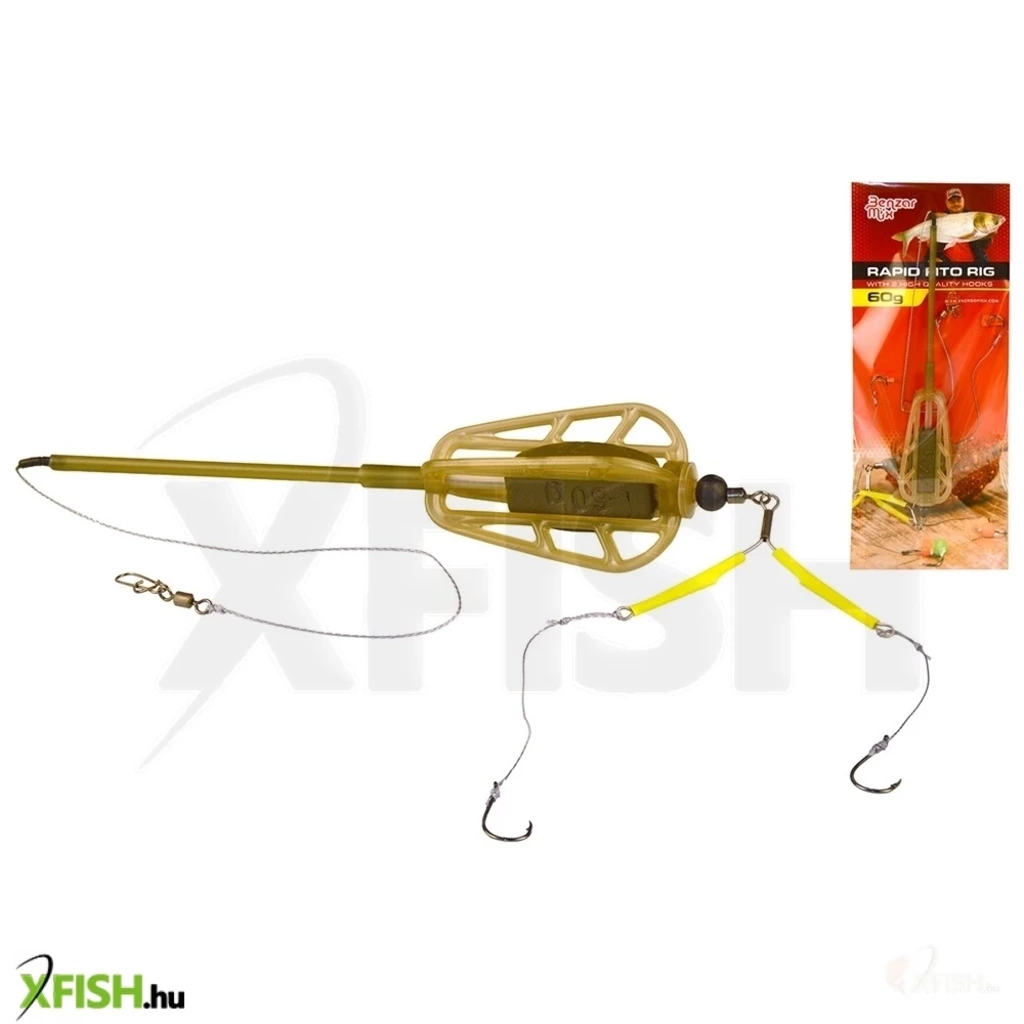 Elkészült ugyanis a Benzár márka kínálatának egyik új, előkötött szereléket megtestesítő eleme, a Rapid Busázó Szerelék. Ez egy olyan, profi, kiváló minőségű alkotórészekből álló összeállítás, mellyel nyugodt szívvel eredhet bárki a busák nyomába. A felső ütközőkkel fixált és alul egy erősített, távtartó, dupla karabiner segítségével rögztett kosár etetőanyagbefogadó kapacitása kellően nagy, és, mivel kifejezetten nagy súllyal is elérhető, akár a folyóvízi horgászathoz is megfelelő alternatívát jelent. A horgok minőségi, tűhegyes és nagyon-nagyon erős kampók, melyekről nem fognak a jó busák sem lemaradni! Mint látható, kéthorgos megoldásról van szó. Az egyik előke 7, a mésik pedig 10 cm hosszú. Természetesen mindkettőt érdemes technopufival ellátva bevetni!