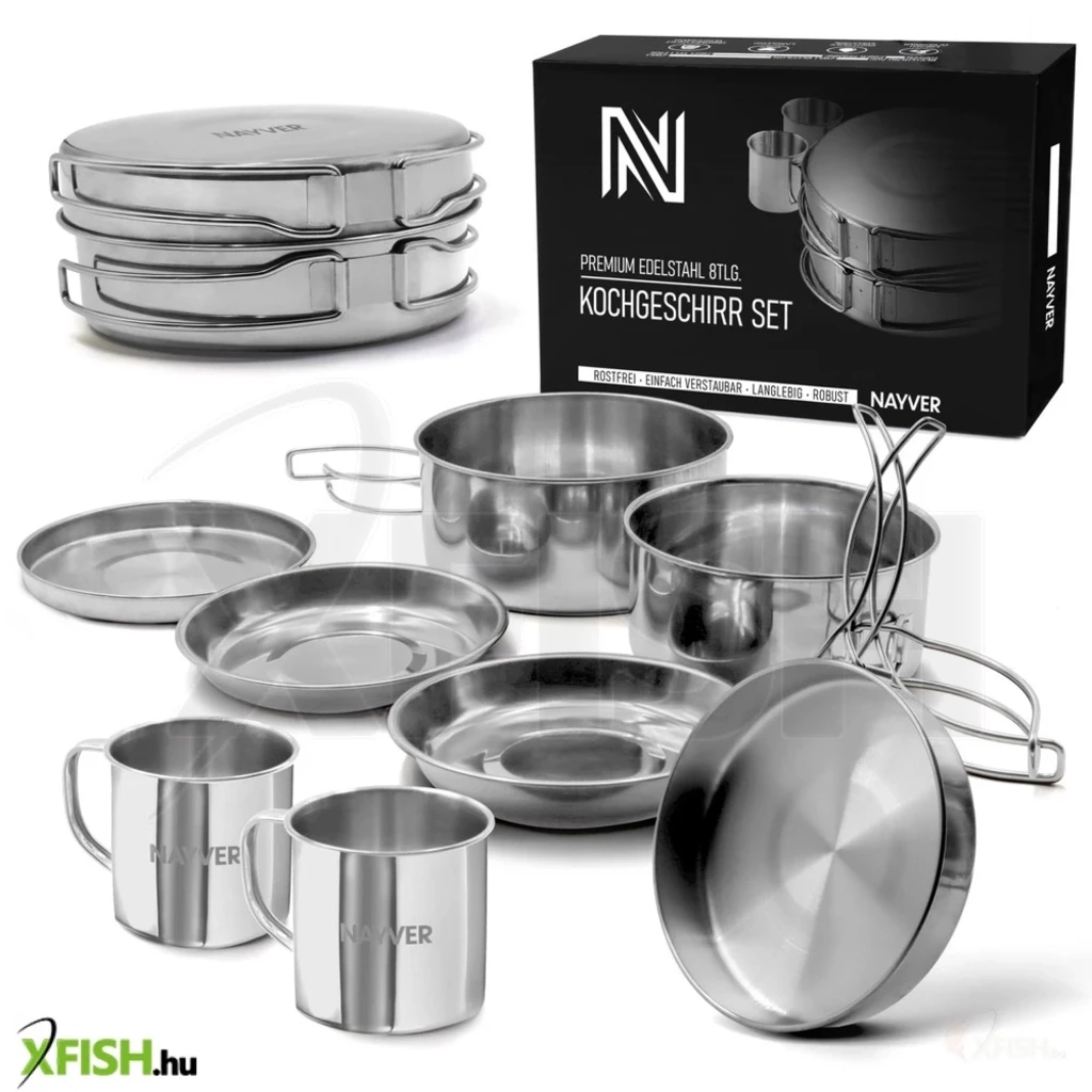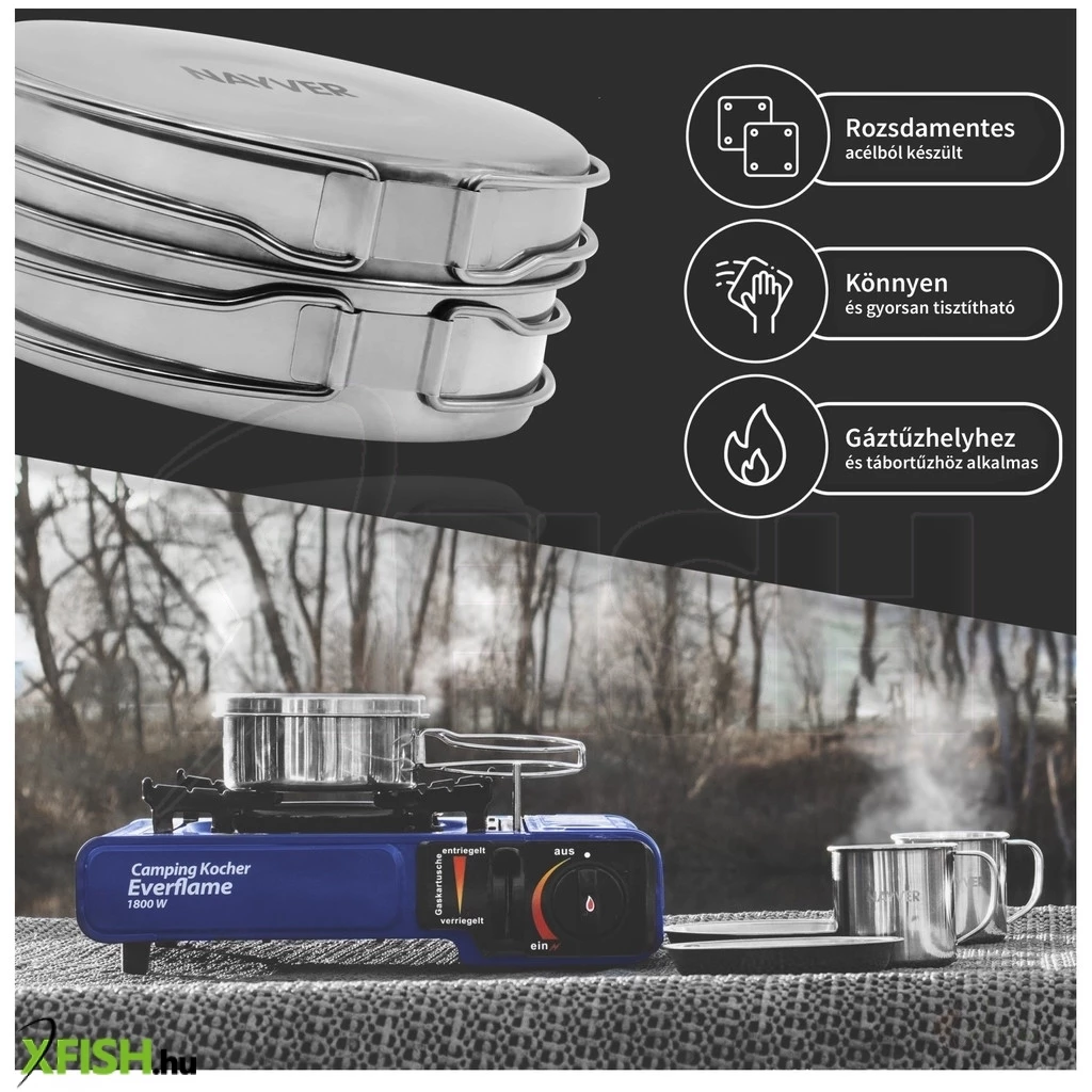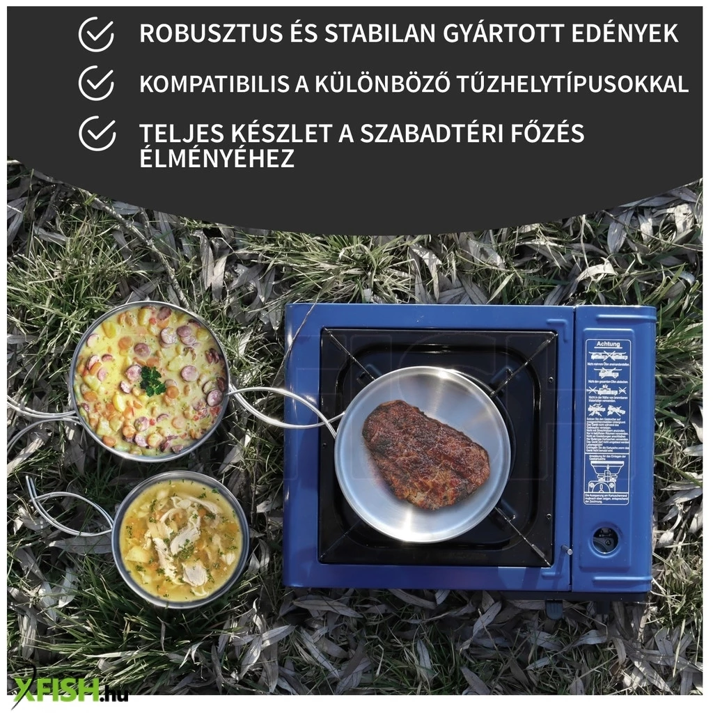 Rozsdamentes acél főzőkészlet olyan szabadtéri tevékenységekhez, mint a horgászat, vadászat, túrázás és kempingezés. Ideális gázfőzőkhöz és tábortűzhöz is.Tartós, robusztus és könnyen tisztítható a kiváló minőségű, sima rozsdamentes acélnak köszönhetően.Helytakarékos kialakítással rendelkezik az útközbeni használathoz. Nagyfokú funkcionalitás a fazékként, fedőként és tányérként való használatnak köszönhetően.