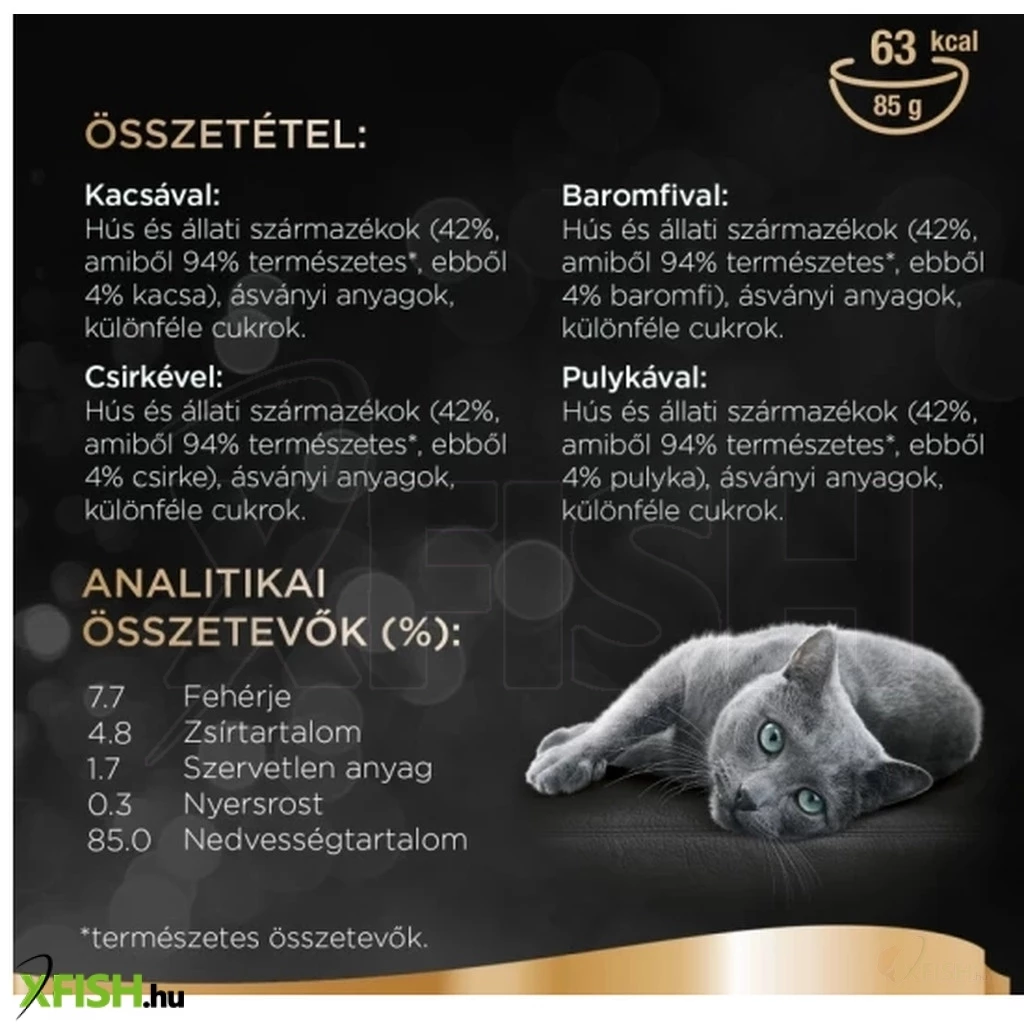 Kacsával: hús és állati származékok (42%, amiből 94% természetes*, ebből 4% kacsa), ásványi anyagok, különféle cukrok,