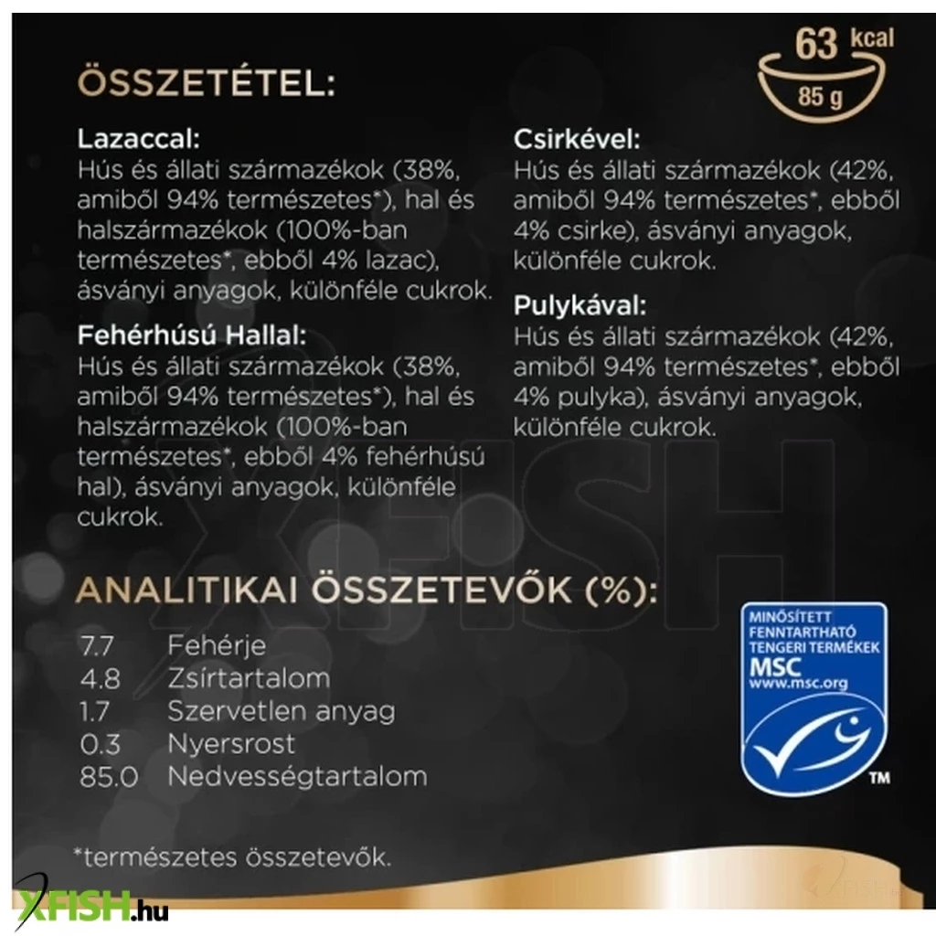 Összetétel: hús és állati származékok (38%, amiből 94% természetes*), hal és halszármazékok (100%-ban természetes*, ebből 4% lazac), ásványi anyagok, különféle cukrok. *természetes összetevők.