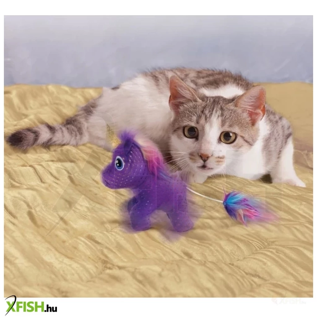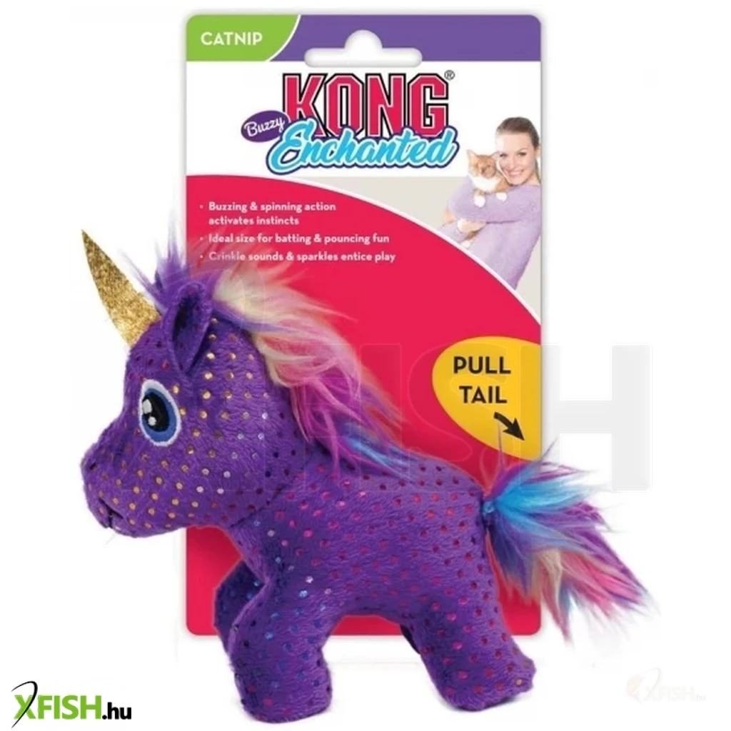 A zümmögés és a pörgés akkor kezdődik, amikor az egyszarvú farkát meghúzzuk. Ez aktiválja a macska természetes ragadozó ösztöneit és elkapja a játékvágyakat. Kibővítik a szórakozást a csikorgó hangok, a csillogó színek és a Kong észak-amerikai prémium macskamenta, amelyek mind-mind elfoglalják a cicát egy varázslatos játékban.