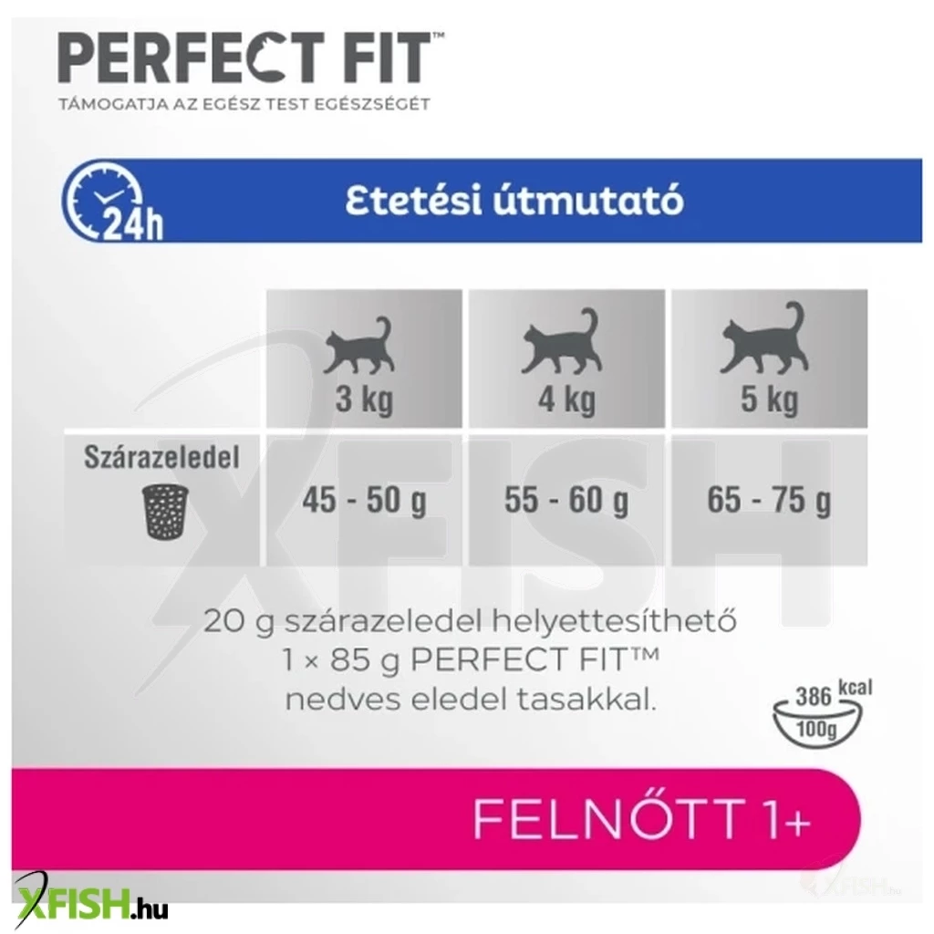 Etetési útmutató: 3kg-os cicának 45 - 50g, 4kg-os cicának 55-60g, 5 kg-os cicának 65-75g szárazeledel naponta. 20 g szárazeledel helyettesíthető 1 db 85 g Perfect Fit nedves eledel tasakkal. Számolja a jutalomfalatokból származó kalóriát. Az etetési mennyiségek csak iránymutatásként szolgálnak. A macska életkorának, méretének és aktivitási szintjének megfelelően határozza meg az eledel mennyiségét. Az egész napos etetéshez ossza el adagokra. Kérjük, étrendváltáskor fokozatosan vezesse be az eledelt. További információkért kérjük, látogasson el weboldalunkra. Kínáljon hozzá friss vizet. Száraz, hűvös helyen tárolandó.