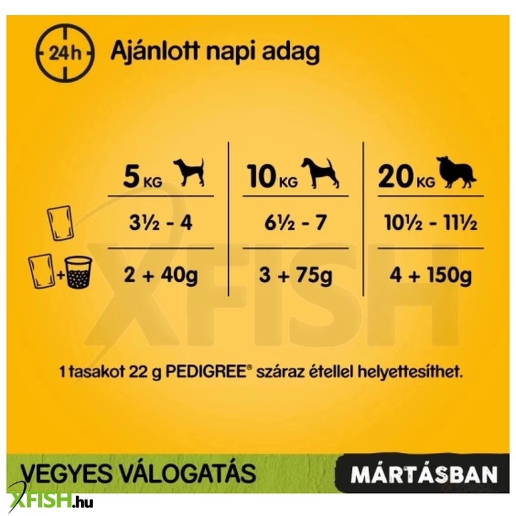 A Pedigree alutasakos eledeleket állatorvosokkal és táplálkozási szakértőkkel együttműködve fejlesztik ki a Waltham kisállat táplálkozási Központban, azért, hogy a kisállatok hozzájussanak minden szükséges tápanyaghoz, segítve a megfelelő emésztésüket, az egészséges bőr és szőrzet kialakulását, a szervezet természetes védekezőképességét és az egészséges csontozat fejlődését. A Pedigree alutasakos kutyaeledelek nem tartalmaznak mesterséges színezéket, ízfokozót vagy tartósítószert. A Pedigree meggyőződése, hogy a kutya pozitív hatással van ránk. Az ártatlanságuk a legjobbat hozza ki belőlünk minden nap. Az ízletes és egészséges Pedigree eledelek és jutalomfalatok széles választéka biztosítja a szükséges tápanyagokat, erősíti a kutyákkat, megvédi és elősegíti az életszeretetük kialakulását is. Ennek köszönhetően a gazdik segítenek kialakítani a megfelelő szokásokat minden nap. Az ízletes, teljes értékű és kiegyensúlyozott eledelek széles választéka tartalmaz mindent, amire a kutyáknak szükségük van a megfelelő fejlődéshez. Az eledelek annyira finomak, hogy egyetlen kutya sem tud ellenállni nekik, és a farokcsóválás a legjobb bizonyítéka annak, hogy ön kiváló életminőséget biztosít kutyájának.