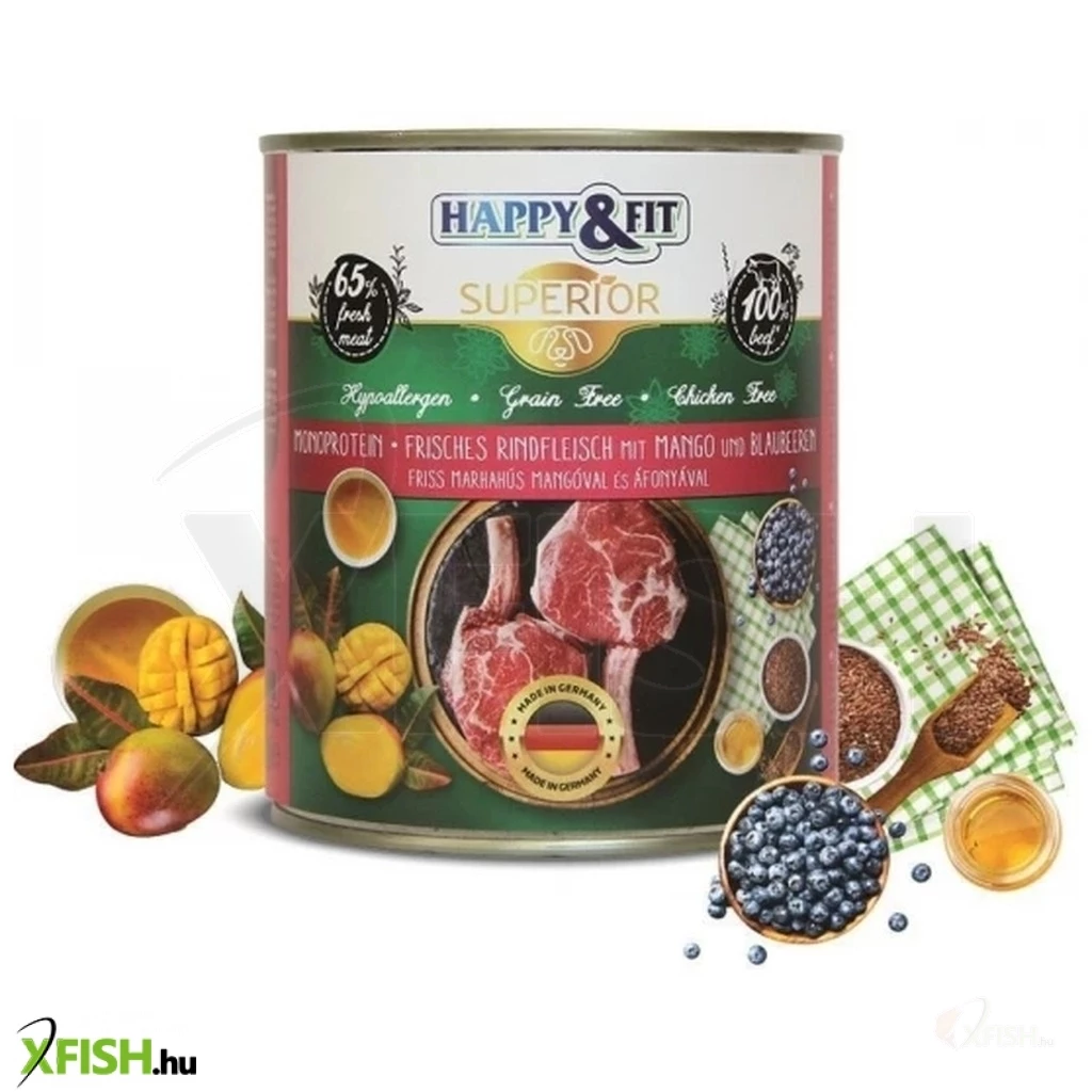Happy&fit superior dog konzerv friss marhahús mangóval, áfonyával 800g, 6 db/csomag
