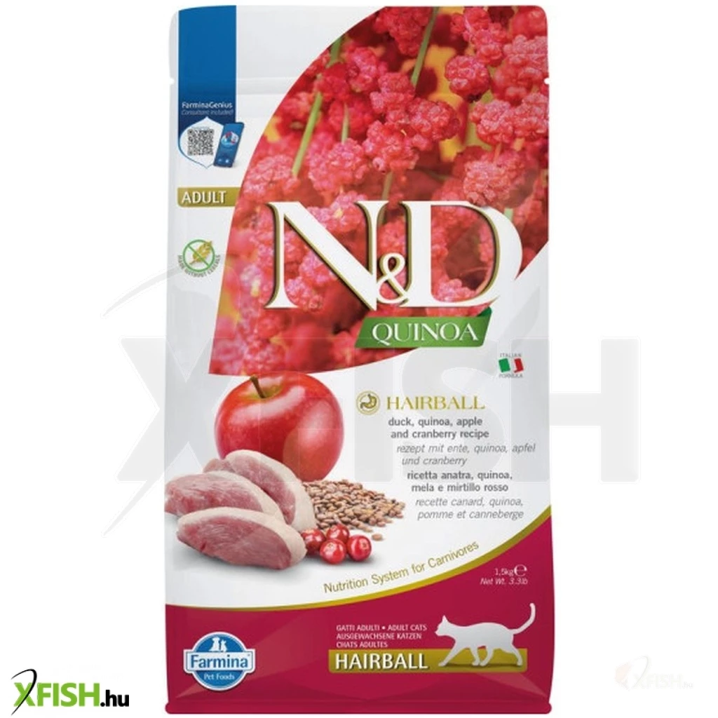 Hairball - kacsa, quinoa, alma és vörösáfonya receptúra. Az N D Quinoa Hairball egy teljes értékű eledel macskák számára, amely a szőrlabdák kiürülésének elősegítésére javallott.
