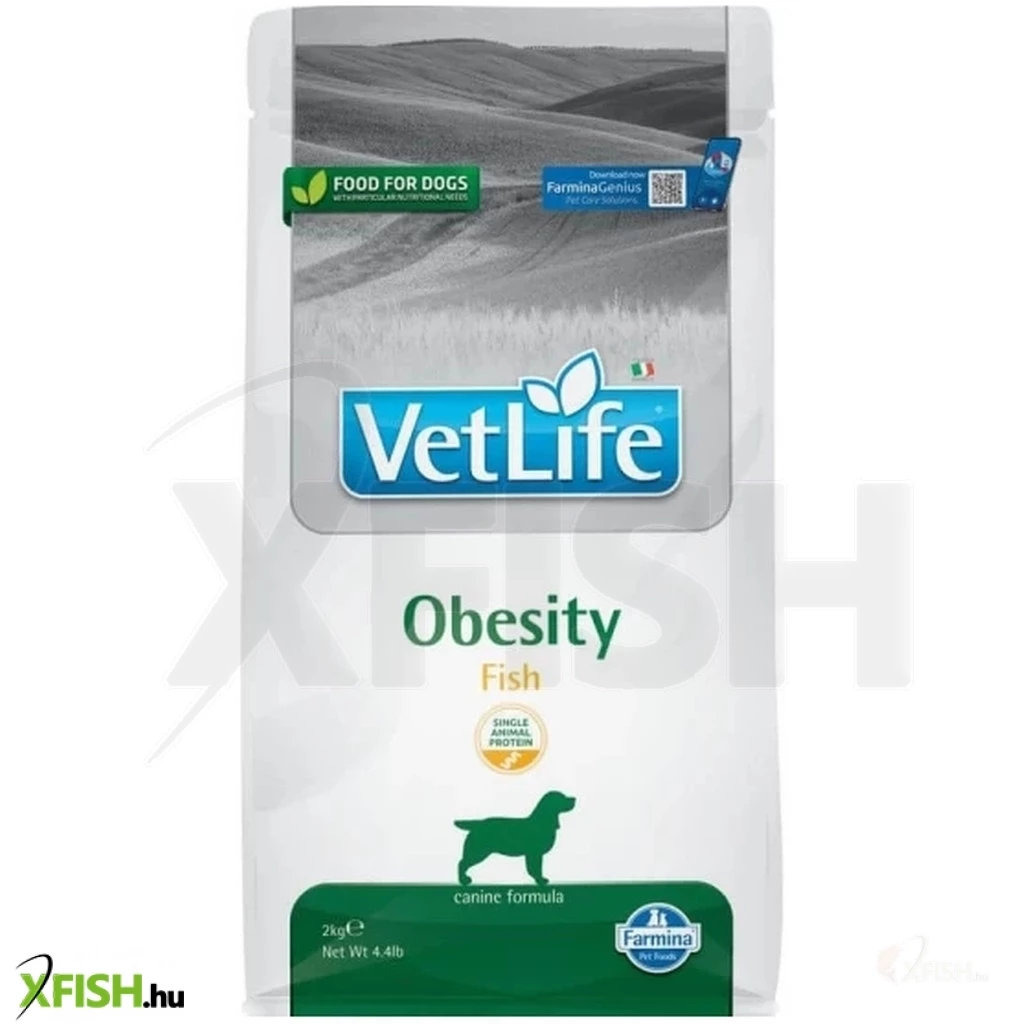 A túlsúly csökkentésére, illetve kisegítő kezelés cukorbetegségben szenvedő kutyák esetében. A Vet Life Obesity az ideális testsúly elérése érdekében csökkentett kalória bevitelt biztosít. Magas rosttartalma biztosítja kedvence jóllakottság érzését és csökkenti éhségérzet kialakulását. Cukorbetegségben szenvedő kutyák számára is ideális eledel alacsony keményítő és kalóriatartalma miatt. A hozzáadott magas karnitin és fehérje tartalma segíti a zsírégetést és az izomtömeg megtartását. Alacsony zsírtartalom, de magas esszenciális zsírsav bevitel. Összetétel: tönköly, szárított répapép, dehidratált hal fehérje (28%), zab, halolaj, hidrolizált halfehérje (3%), lenmag, kálium-klorid, nátrium-klorid, kalcium-karbonát, monodikalcium-foszfát. Szénhidrátforrások: tönköly, zab. Analitikai összetevők: nyersfehérje 22,00%; nyerszsír 6,20%; nyers rostok 7,80%; nyershamu 7,80%; kalcium 1,00%; foszfor 0,80%; nátrium 0,30%; kálium 0,70%; magnézium 0,13%; keményítő 24,00%; teljes cukor 1,90%; Omega-6 zsírsavak 1,80%; Omega-3 zsírsavak 1,00%; EPA 0,20%; DHA 0,35%. Adalékanyagok: tápértékkel rendelkező adalékanyagok/kg: A-vitamin 10000ne; D3-vitamin 400ne; E-vitamin 600mg; C-vitamin 100mg; Niacin 25mg; Kalcium-D-pantotenát 10mg; B2-vitamin 5mg; B6-vitamin 4 mg; B1-vitamin 3mg; Biotin 0,25 mg; Folsav 0,30 mg; B12-vitamin 0,04 mg; Kolin-klorid 2500 mg; Béta karotin 1,5 mg; Cink (Hidroxi - analóg cink kelátja) metionin): 174,6 mg; Mangán (mangán kelát metionin hidroxi-analógja: 68 mg; Vas [vas (ii)] glicin-hidrát kelát]: 43,1 mg; Réz (réz metionin-hidroxi analóg kelátja): 12,2 mg; Szelén (Szeléntartalmú inaktivált élesztő): 0,14960 mg; Jód