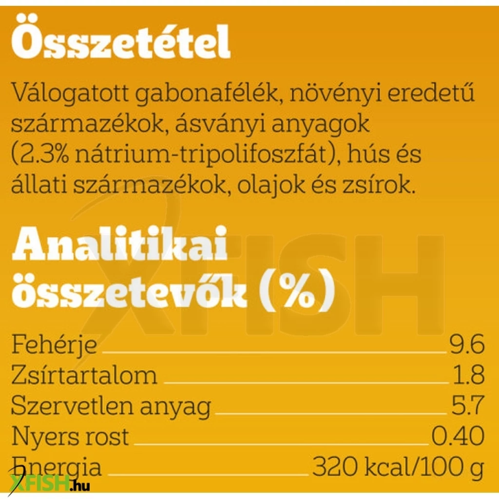 Válogatott gabonafélék, Növényi eredetű származékok, Ásványi anyagok 2,7% nátrium-tripolifoszfátot tartalmaz, Hús és állati származékok, Olajok és zsírok
