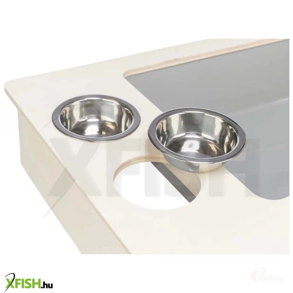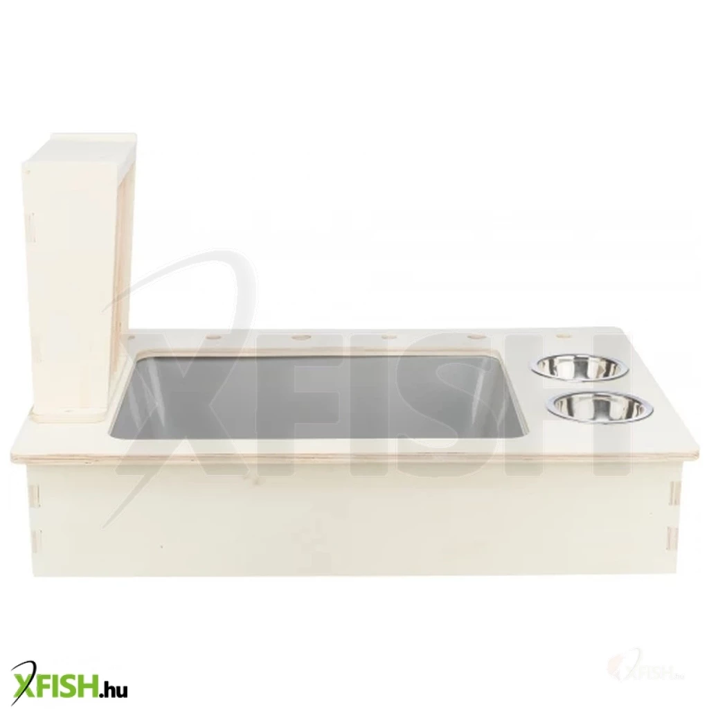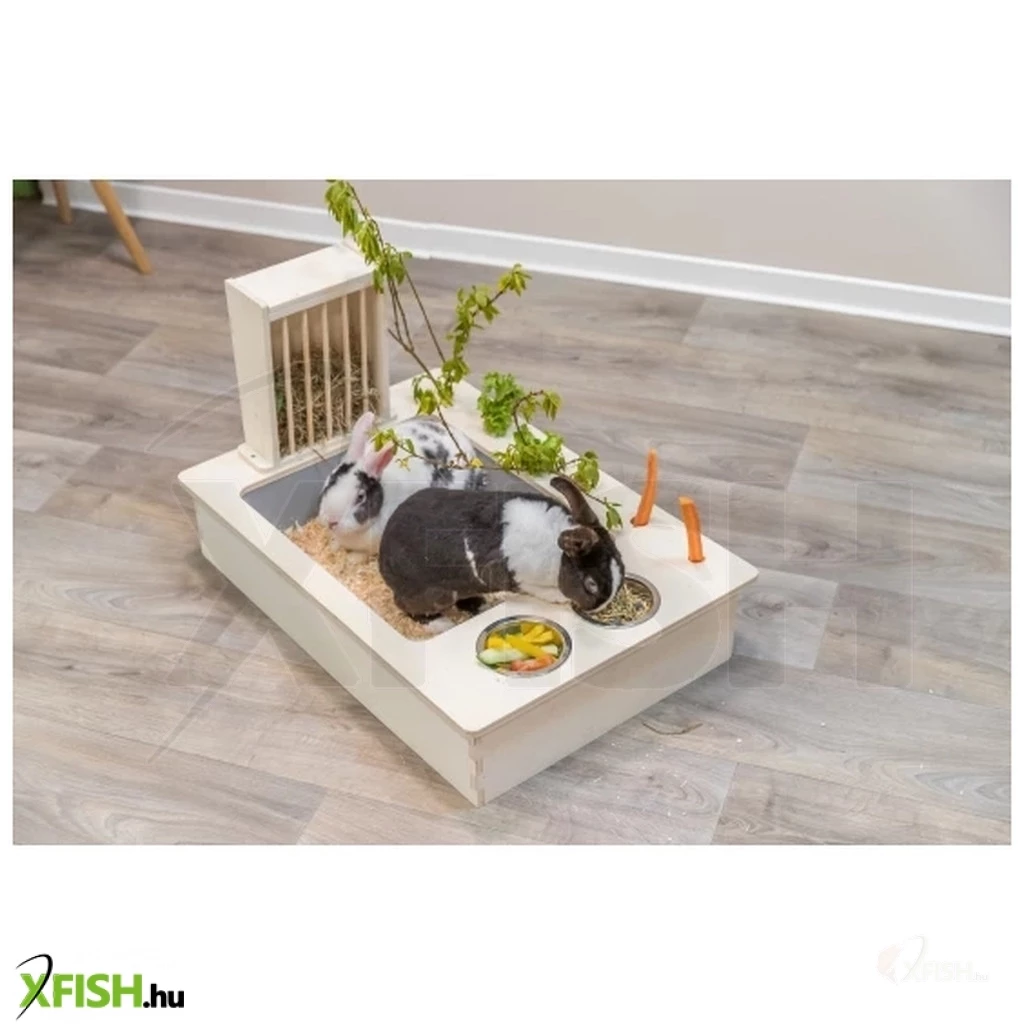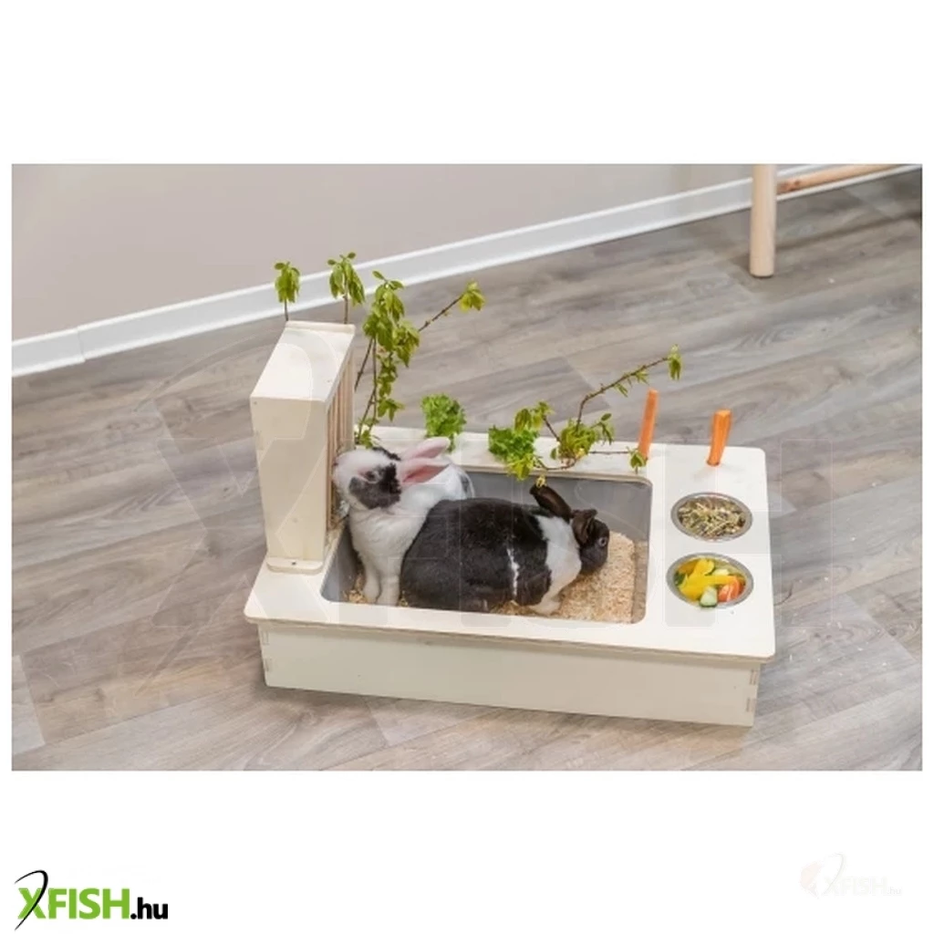 Etetőállomás tengerimalacok és nyulak számára 2 rozsdamentes acél tállal, szénatartóval, kivehető műanyag WC-vel és több nyílással a zöldségek és ágak elhelyezéséhez. Kezeletlen fából készült. A fa ajtók mögé zárt műanyag wc gondoskodik arról, hogy kedvence ne hordja szét az almot a lakásban. A wc aljába helyezzen el az állat számára megfelelő almot, amit rendszeresen cseréljen ki. Méretek: 70 × 41 × 47 cm. Az állat előtt mindig legyen friss, tiszta ivóvíz! Forgalmazza: Alpha-Vet Állatgyógyászati Kft., 1194 Budapest, Hofherr A. u. 42. vevoszolgalatbp@alpha-vet.hu