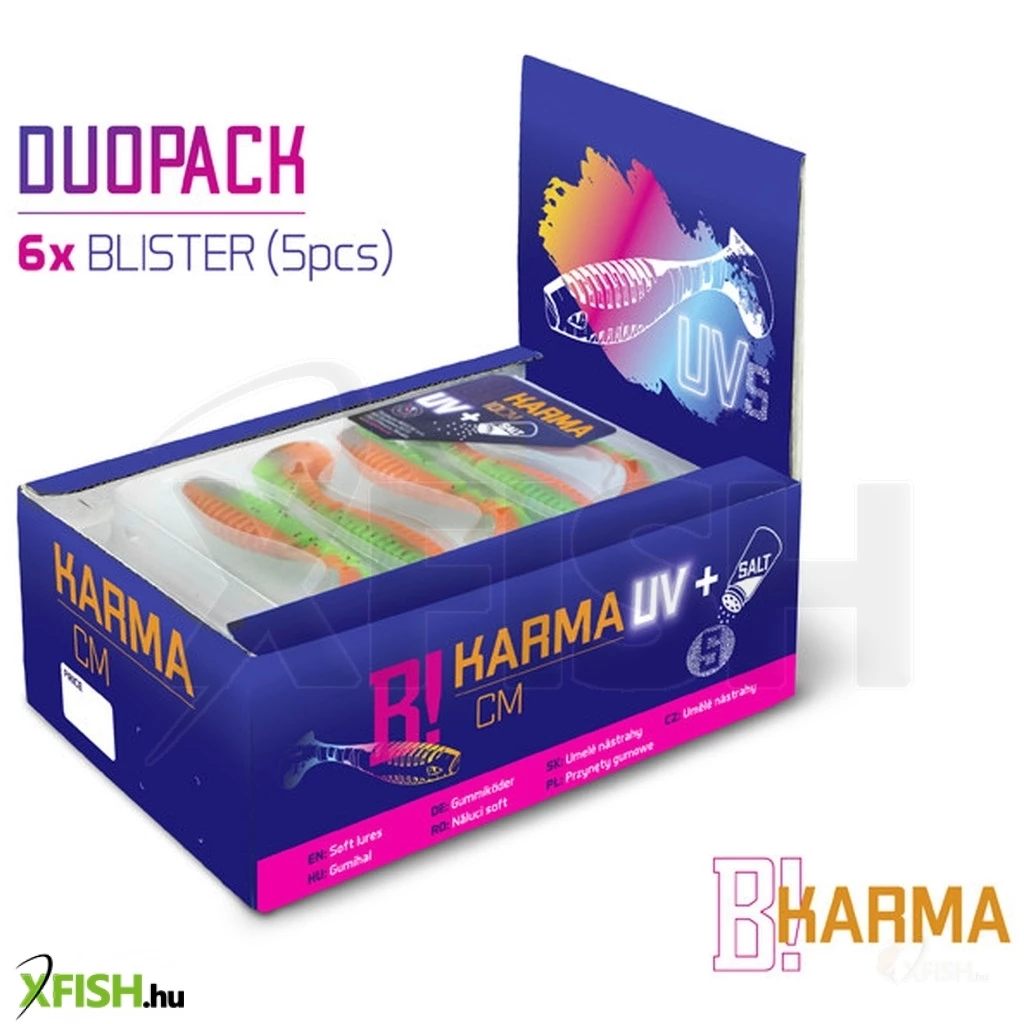 A KARMA modell tervezését kezdettől fogva nem klasszikus megoldásként választottuk a klasszikus modellhez. A cél egy sokrétű felhasználást lehetővé tevő csali megalkotása volt. Első pillantásra észreveheti, hogy a testméret és a csali farok aránya eltér a szokásostól. A csali nagyobb farka a csali atipikus mozgását okozza, ami a farok oszcillációja mellett a test gyengéd forgását is hozzáteszi, ami sérült egyed benyomását kelti. Ez a mozgás rendkívül vonzó a halak számára, és új lehetőségeket kínál a csalival való munka során. A csalitest és a farok csatlakozása között három bevágást modelleznek, amelyek hitelességet adnak a csali mozgásának. A csali teste a háton és a hason rovátkolt. Ennek két oka van. Az első a víz vibrációjának növelése. A második ok az, hogy megkönnyítsük a csali horogra helyezését. A bevágások segítségével pontosan le tudod mérni, hogy a csaliba hova kerül a horog. A jigre való felszúrás így egyszerű. A csali elülső részén a száj területén egy kivágással van módosítva, hogy a csali jobban illeszkedjen a jigfejhez.
