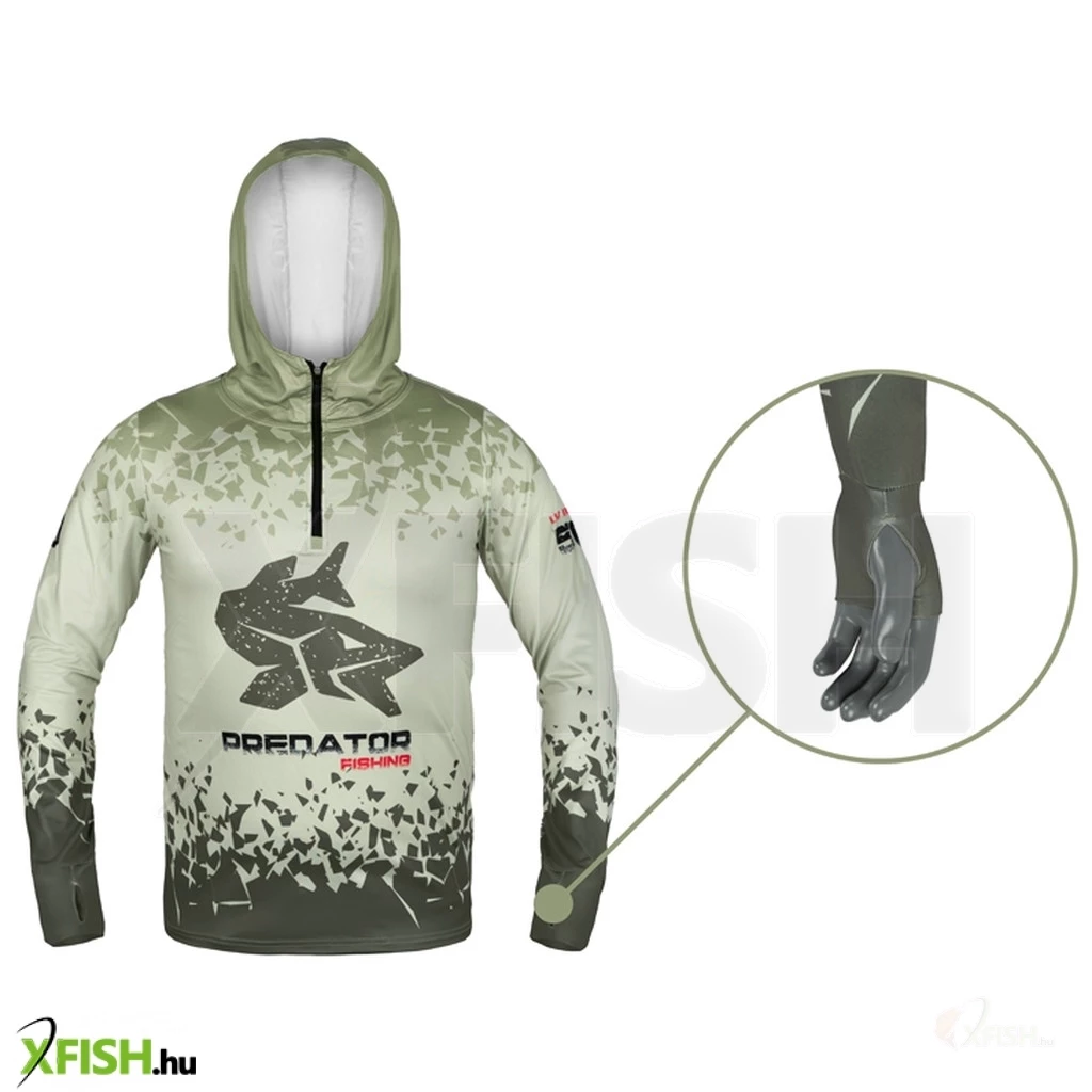 Tervezésekor figyelembe vettük azt is, hogy a melegnek leginkább kitett testrészünk a fejünk. Ez a póló jelentősen megemelt gallérral és kapucnival rendelkezik, valamint hüvelykujjlyukakkal ellátott meghosszabbított ujjakkal, ezzel fokozva kézfejünk védelmét. A kényelmes, rugalmas anyag nagy előnye, hogy gyorsan szárad, ha horgászat közben elázna.