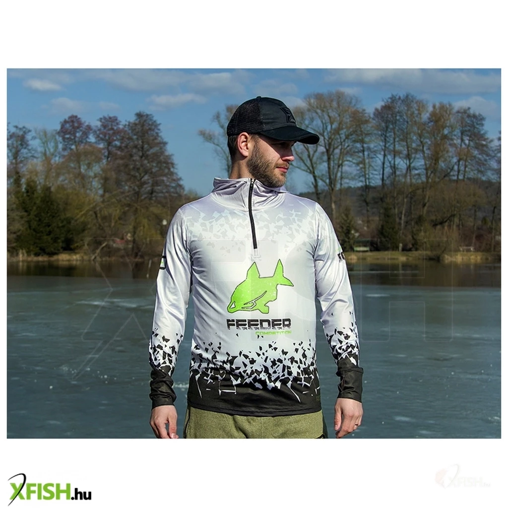 Tervezésekor figyelembe vettük azt is, hogy a melegnek leginkább kitett testrészünk a fejünk. Ez a póló jelentősen megemelt gallérral és kapucnival rendelkezik, valamint hüvelykujjlyukakkal ellátott meghosszabbított ujjakkal, ezzel fokozva kézfejünk védelmét. A kényelmes, rugalmas anyag nagy előnye, hogy gyorsan szárad, ha horgászat közben elázna.