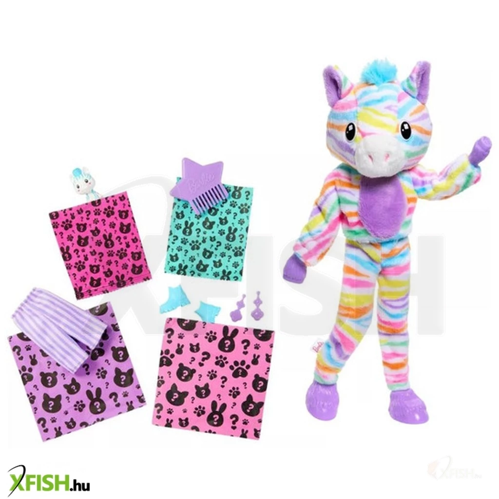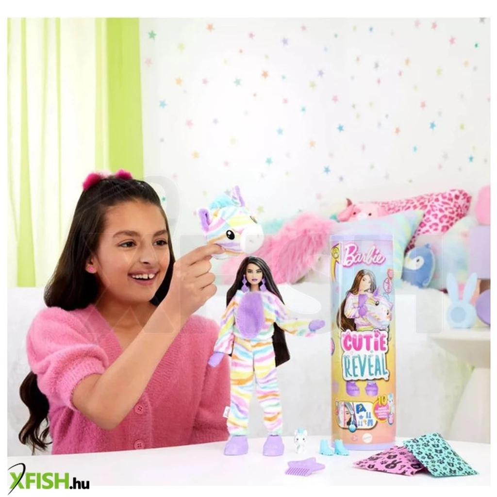 A Barbie Cutie Reveal Zebra baba készletben egy szivárványos zebra jelmezes Barbie található, aki alatt egy divatos baba rejtőzik. A szett több mint 10 meglepetést kínál, köztük egy kis zebra figurát és kiegészítőket. A levehető jelmez és a csere-ruhadarabok kreatív játékot biztosítanak, a hosszú haj formázásához pedig fésű is tartozik.
