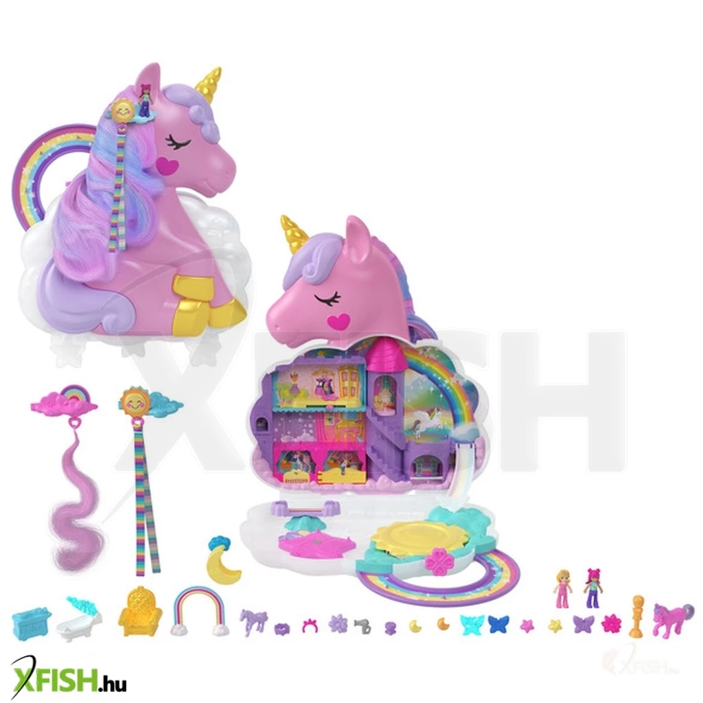 A szett tartalmaz egy Polly Pocket babát és számos kiegészítőt, amelyekkel a gyerekek saját történeteket alkothatnak. A szalonban különböző hajformázó eszközök, fésűk és hajcsatok találhatók, amelyekkel az unikornis puha haját lehet formázni és díszíteni. A szivárványos hordozófogantyúval ellátott doboz könnyen szállítható, így bárhová magukkal vihetik a gyerekek.