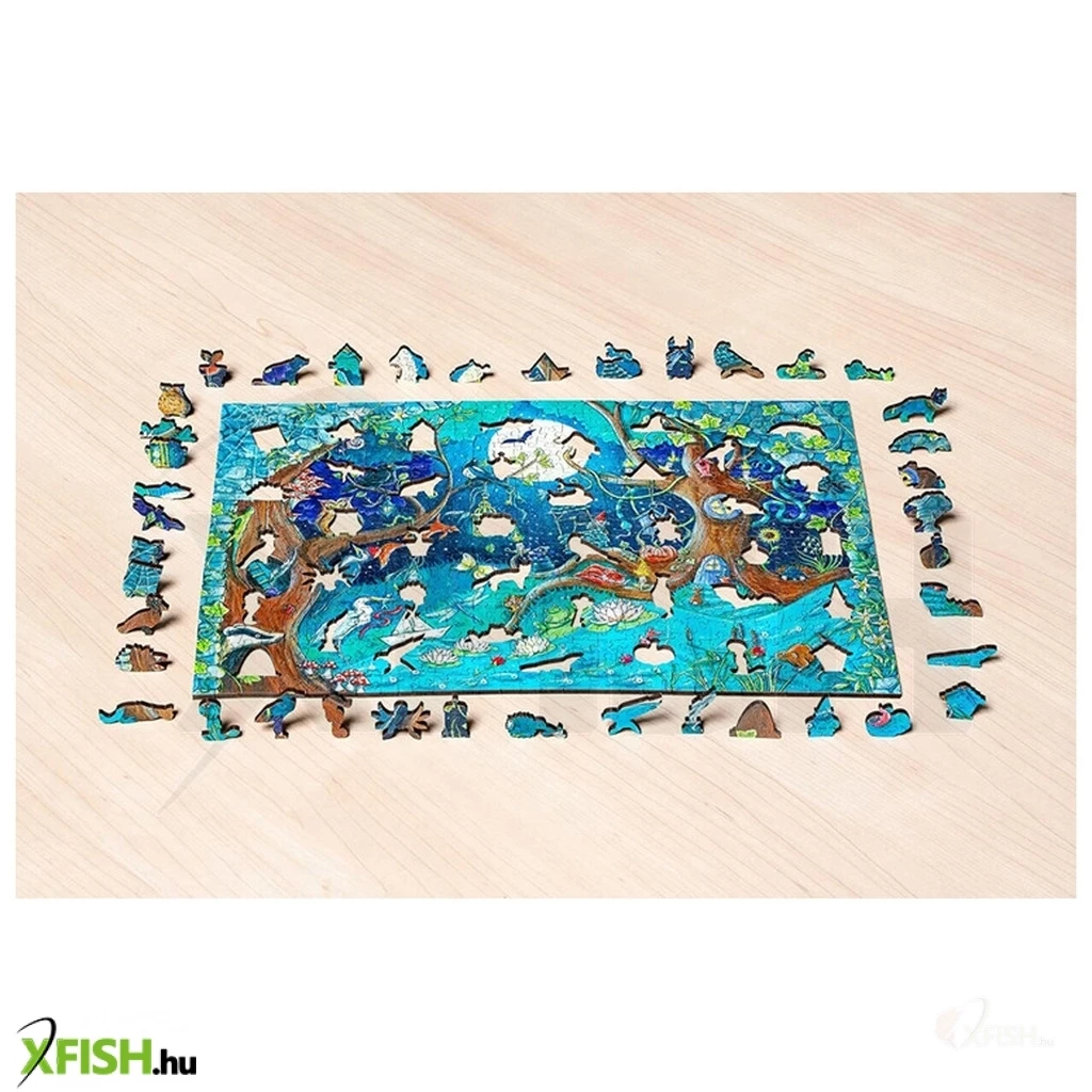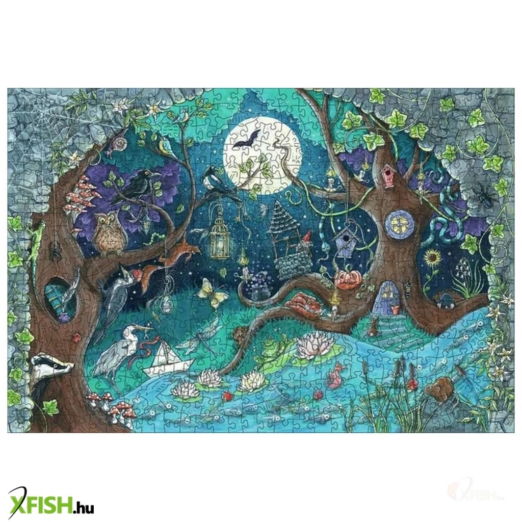A Ravensburger 500 db-os fa puzzle - Fantasy Forest című képen egy mesés erdei világ tárul a szemünk elé. A fényes holdvilágnál a fák közül előbújó erdei állatok - mókus, bagoly, borz - között egy erdei törpét is felfedezhetünk, ahogy lakájos otthona mellett tevékenykedik.