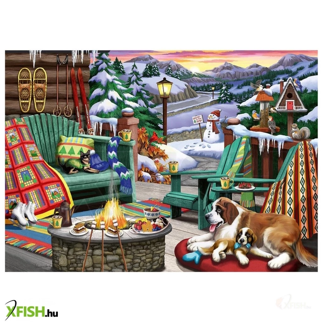 A Ravensburger 1000 db-os puzzle - After Skiing című képen egy hangulatos téli terasz látható, ahol jólesik átmelegedni az egész napos síelés után: forró csoki, finom édességek, meleg pokróc és cuki kutyák teszik még szívmelengetőbbé ezt az illusztrációt.