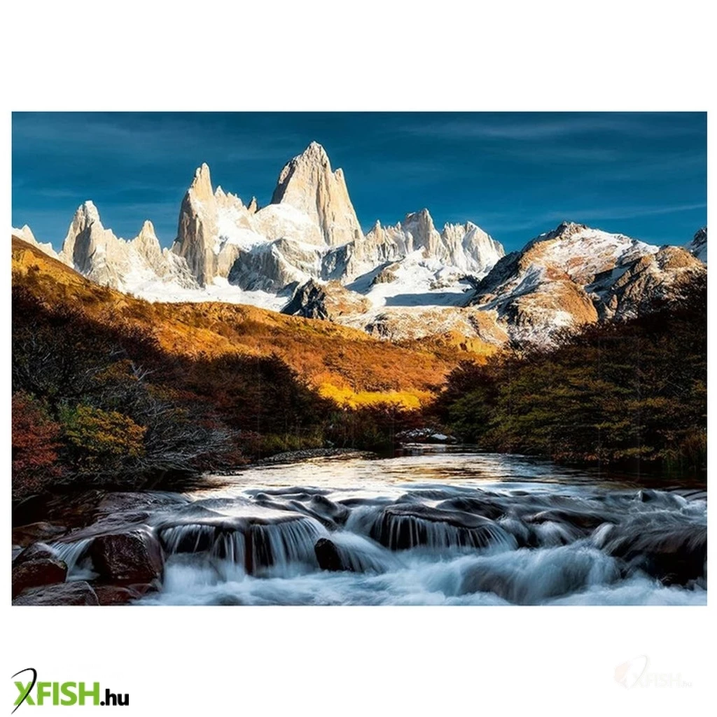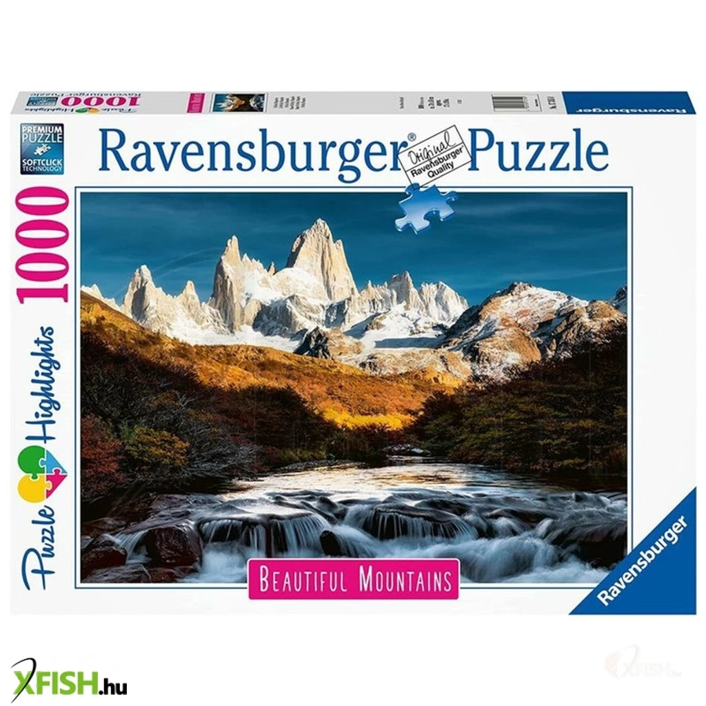 A Ravensburger 1000 db-os - Beautiful Mountains - Fitz Roy, Patagonia című képen az Argentína és Chile közt húzódó hegy és a világ legnehezebben megmászható hegycsúcsa látható. Eredeti - őslakosok által ismert - neve Cerro Chaltén, mely \Füstölgő hegy\-et jelent, és a hegycsúcsot általában körülvevő felhők miatt kapta.