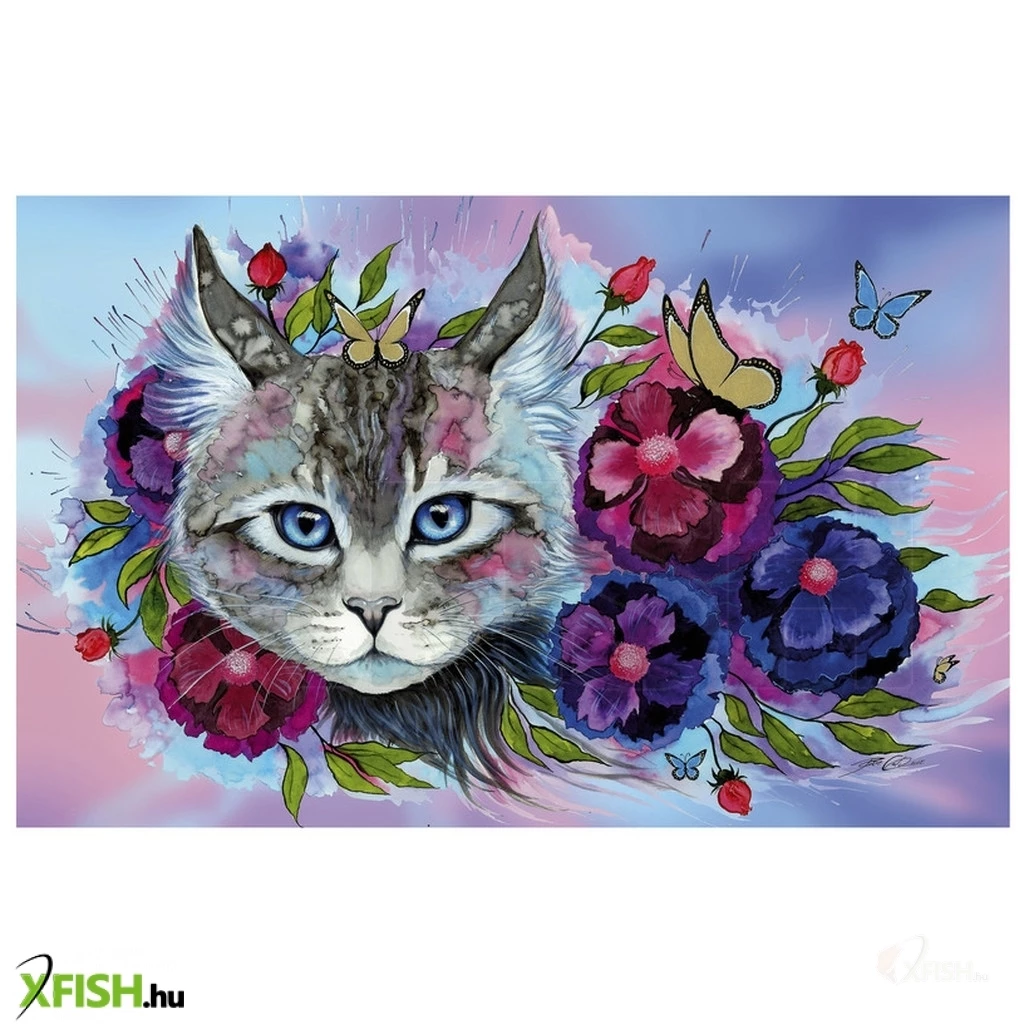 Ezen a kirakó játékon a darabkák helyre illesztése után egy színes virágokkal körülölelt macskát fogunk látni, nagy kék szemekkel.