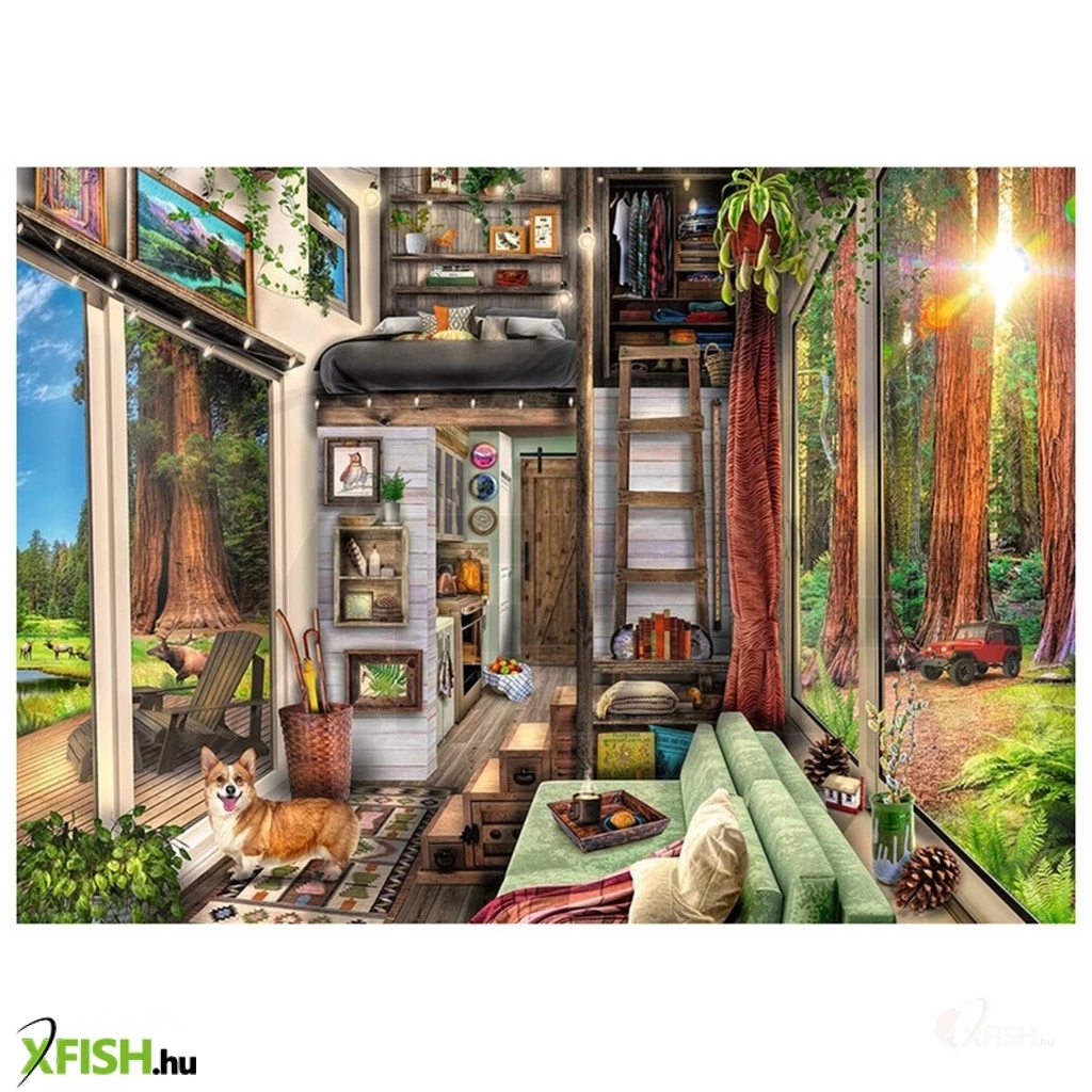 A Ravensburger 1000 db-os puzzle - Redwood Forest Tiny House című képen Jason Taylor kaliforniai művész alkotásában egy minden igényt kielégítő, otthonos kis erdei házikóba nyerhetünk bepillantást, varázslatos természeti környezetben, a vörösfenyő erdő közepén.