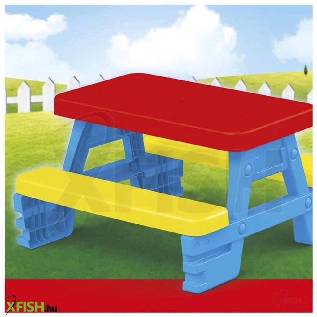 Játsszatok és uzsonnázzatok a kerti asztalnál ülve! A Négyszemélyes piknik asztal egy erős műanyagból készült színes asztal, padokkal. A kültéri asztal négy személyes, az asztalnál ülve játszhattok társasjátékot, rajzolhattok, beszélgethettek, vagy akár uzsonnázhattok is. A készlet ellenáll az időjárásnak, és könnyű összeszerelni. A Négyszemélyes piknik asztal paddal összerakott méretei: 71 x 77 x 43 cm.