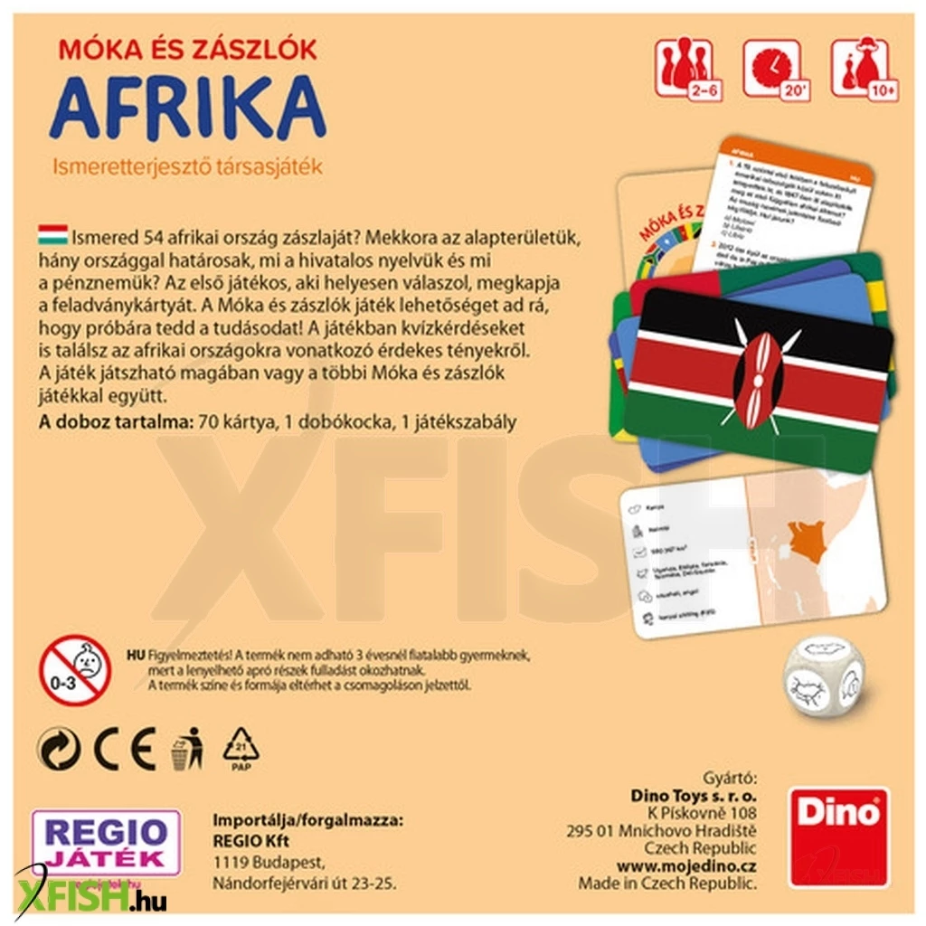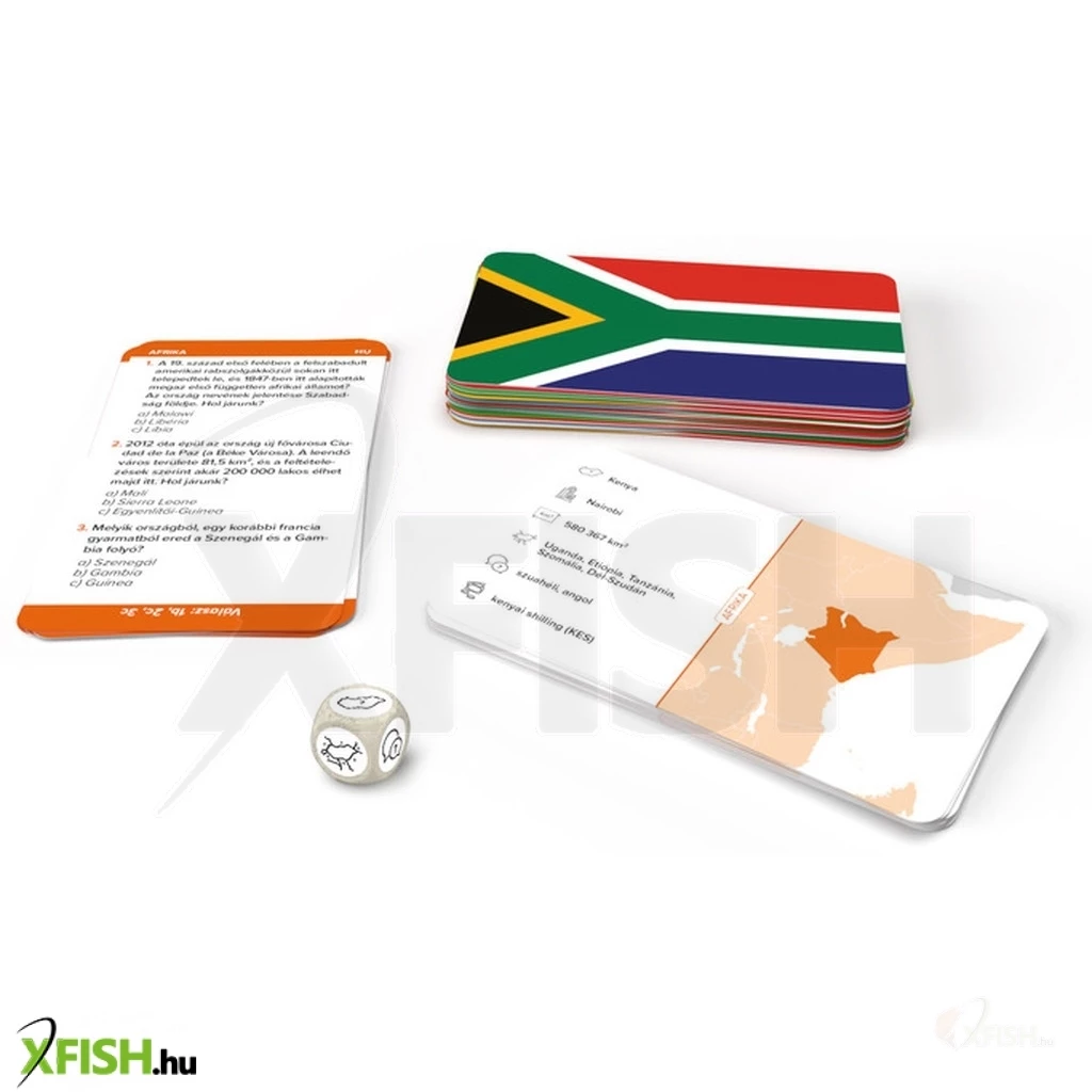 Ismered 54 afrikai ország zászlaját- Mekkora az alapterületük, hány országgal határosak, mi a hivatalos nyelvük és mi a pénznemük- Az első játékos, aki helyesen válaszol, megkapja a feladványkártyát. A Móka és zászlók játék lehetőséget ad rá, hogy próbára tedd a tudásodat! A játékban kvízkérdéseket is találsz az afrikai országokra vonatkozó érdekes tényekről. A játék játszható magában vagy a többi Móka és zászlók játékkal együtt.