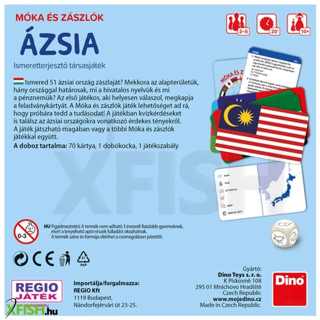 Ismered 51 ázsiai ország zászlaját- Mekkora az alapterületük, hány országgal határosak, mi a hivatalos nyelvük és mi a pénznemük- Az első játékos, aki helyesen válaszol, megkapja a feladványkártyát. A Móka és zászlók játék lehetőséget ad rá, hogy próbára tedd a tudásodat! A játékban kvízkérdéseket is találsz az ázsiai országokra vonatkozó érdekes tényekről. A játék játszható magában vagy a többi Móka és zászlók játékkal együtt.