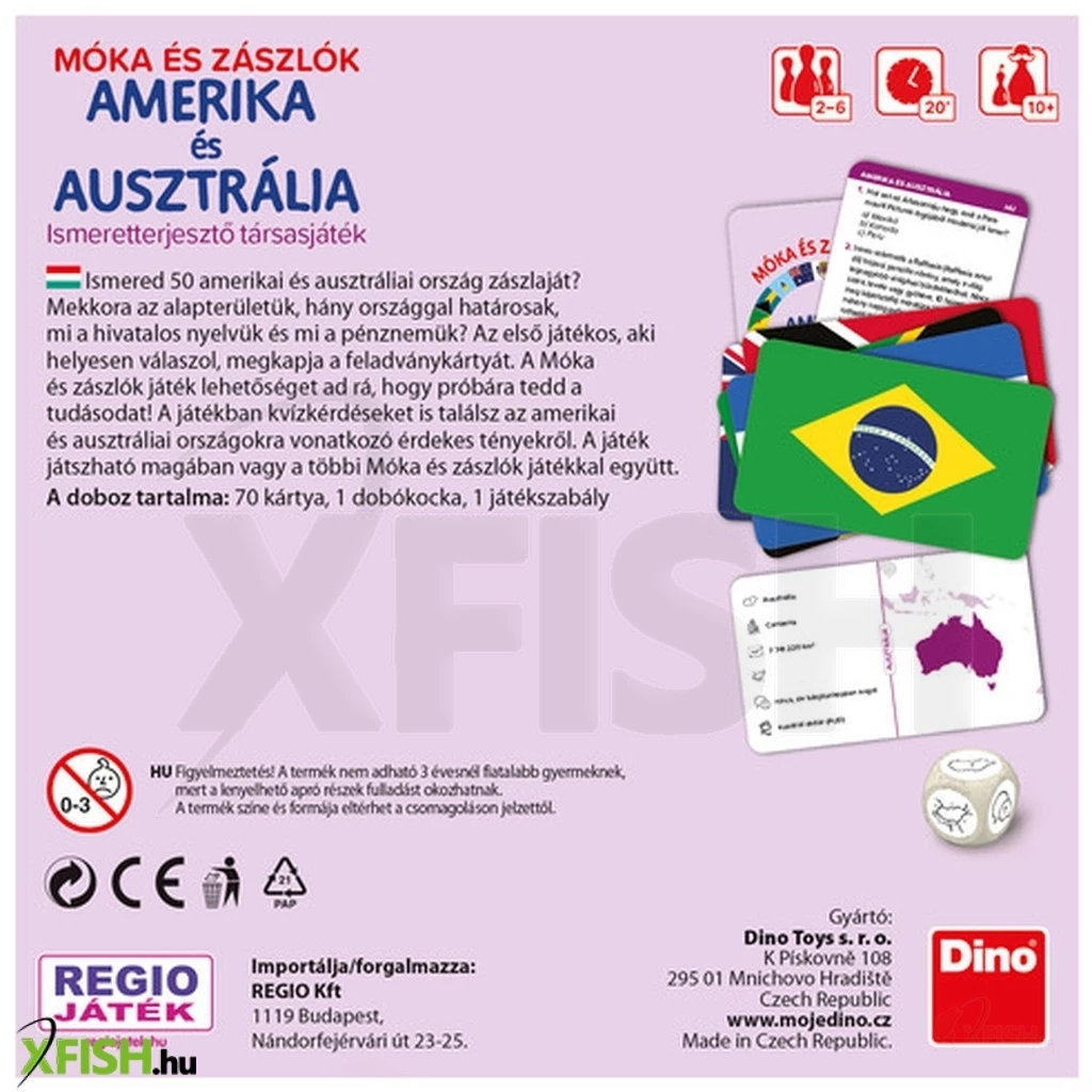 Ismered 50 amerikai és ausztráliai ország zászlaját- Mekkora az alapterületük, hány országgal határosak, mi a hivatalos nyelvük és mi a pénznemük- Az első játékos, aki helyesen válaszol, megkapja a feladványkártyát. A Móka és zászlók játék lehetőséget ad rá, hogy próbára tedd a tudásodat! A játékban kvízkérdéseket is találsz az amerikai és ausztráliai országokra vonatkozó érdekes tényekről. A játék játszható magában vagy a többi Móka és zászlók játékkal együtt.