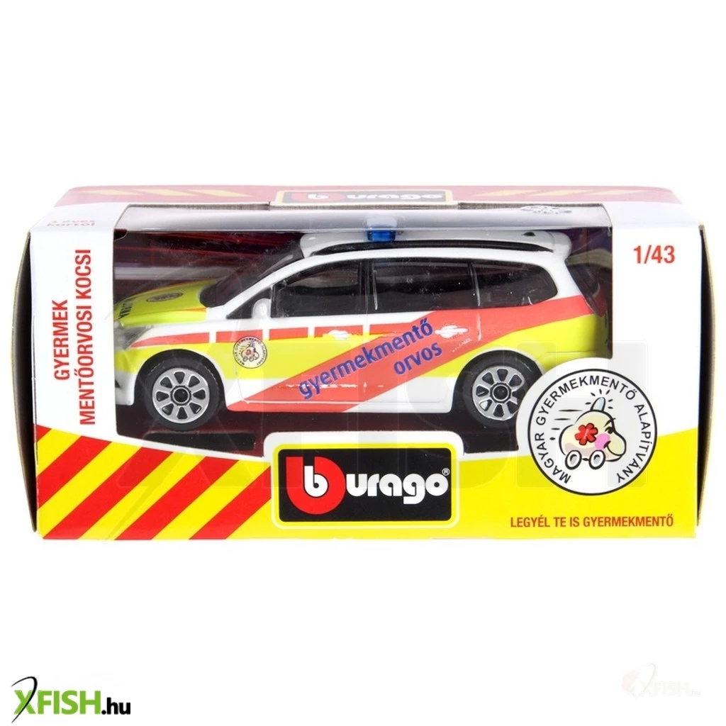 A Magyar Gyermekmentő Alapítvány által használt autók kicsinyített mása. A Bburago gyermek mentőorvosi kocsi egy Ford Focus autó, villogóval és az itthoni mentőorvosi autók festésével. A kisautó fémből és műanyagból készült, bármilyen 1:43 méretarányú pályán használható. Az autó motorháztetején az Ambulance felirat, a Magyar Gyermekmentő Alapítvány logója szerepel, az oldalán a gyermekmentő orvos felirat díszíti. Méretek: 10 x 4 x 4 cm.