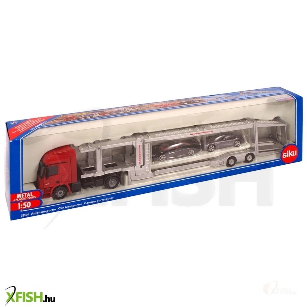Szállíts kisautókat a Mercedes-Benz kamion utánfutóján! Az 1:50 méretarányú Siku: Mercedes-Benz Actros autószállító kamion - 3934 egy fémből és műanyagból készült vontató és utánfutó, amin 1:87 méretarányú Siku autókat lehet szállítani. A kamion és az autószállító is szépen kidolgozott, az autószállító rámpája leengedhető, a felső platót is meg lehet dönteni, hogy az autók könnyen fel tudjanak állni a helyükre. A Siku: Mercedes-Benz autószállító 1:50 - 3934 együtt használható más 1:50 méretarányú Siku készletekkel is. A kamion méretei: 46 x 7 x 12 cm.