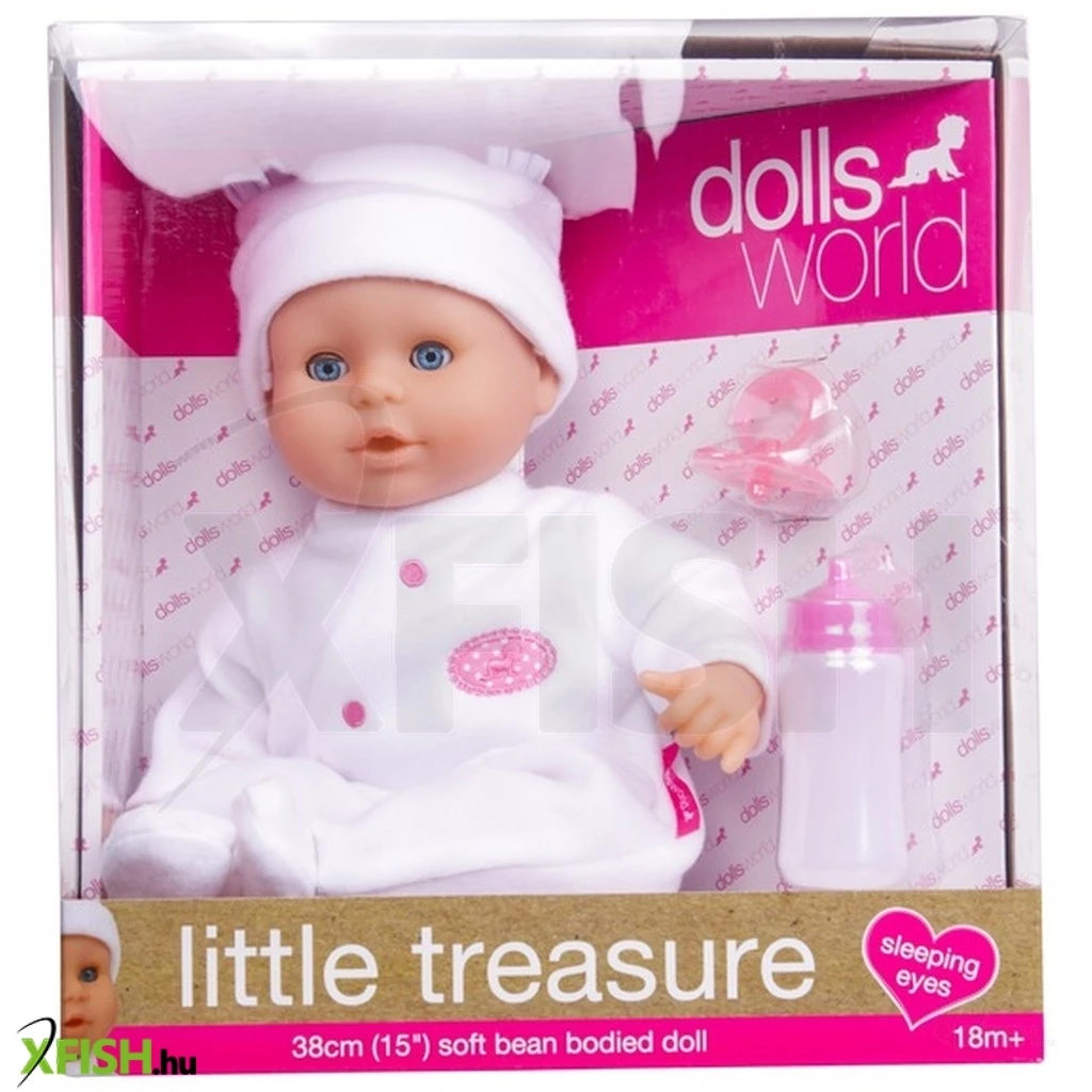 Gondozd a Little Treasure babát, foglalkozz vele sokat! A Little Treasure fehér ruhás babzsákos babát meg tudod etetni a cumisüvegből, és ha hanyatt döntöd, lehunyja a szemeit. Alvás közben add a szájába a cumit, hogy nyugodtabb legyen az álma. A baba pocakja babzsákkal van töltve, a feje puha gumiból készült. A Little Treasure babzsákos baba fehér ruhában együtt használható minden Dolls World készlettel és kiegészítővel! Méret: 38 cm.