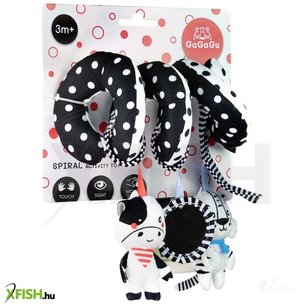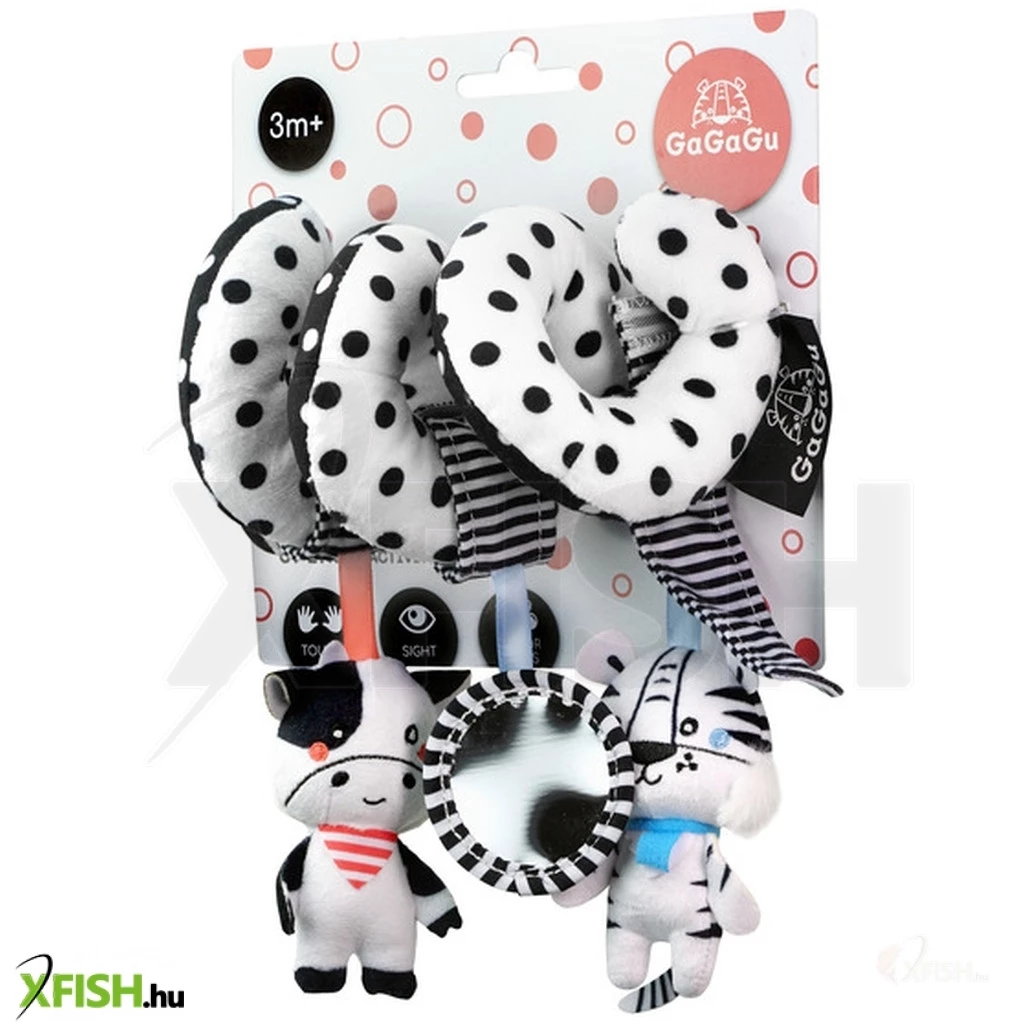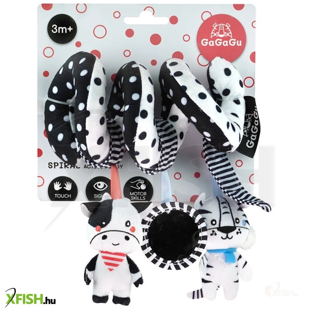 A GaGaGu spirál kontrasztos színű és mintájú, ami serkenti a csecsemő látását. A plüss elemek - boci és kis tigris - kedvet csinálnak a gyermekeknek a játék megragadására, és segítik az ún. finom motorika gyakorlását (az ujjak és a tenyér mozgatása). Az egyik függőn egy tükör található, amely felkelti a csecsemő figyelmét, kedvet csinál a függő megragadására és saját tükörképe megismerésére. A spirál alakja lehetővé teszi a babakocsi, gyermekülés, hordozó vagy babaágy köré tekerését, műanyag elemek használata nélkül. A spirál teljes egészében anyagból készült, nagyon könnyű és kézreálló, könnyen tárolható, ideális arra, hogy magunkkal vigyük egy sétára vagy utazásra. Nem tartalmaz műanyag elemeket, szalagok segítségével rögzíthető a kiságyhoz vagy babakocsihoz. 3+ hónapos kortól alkalmas a gyermekeknek.