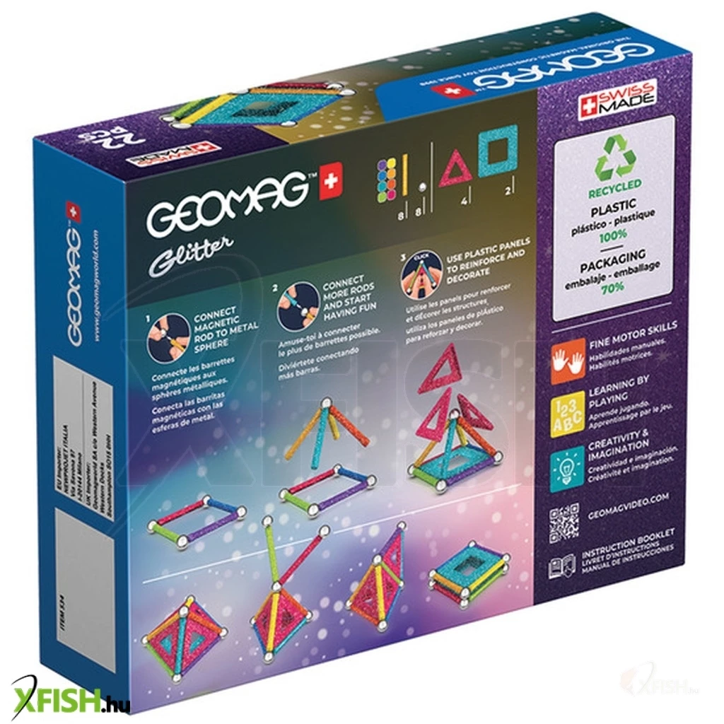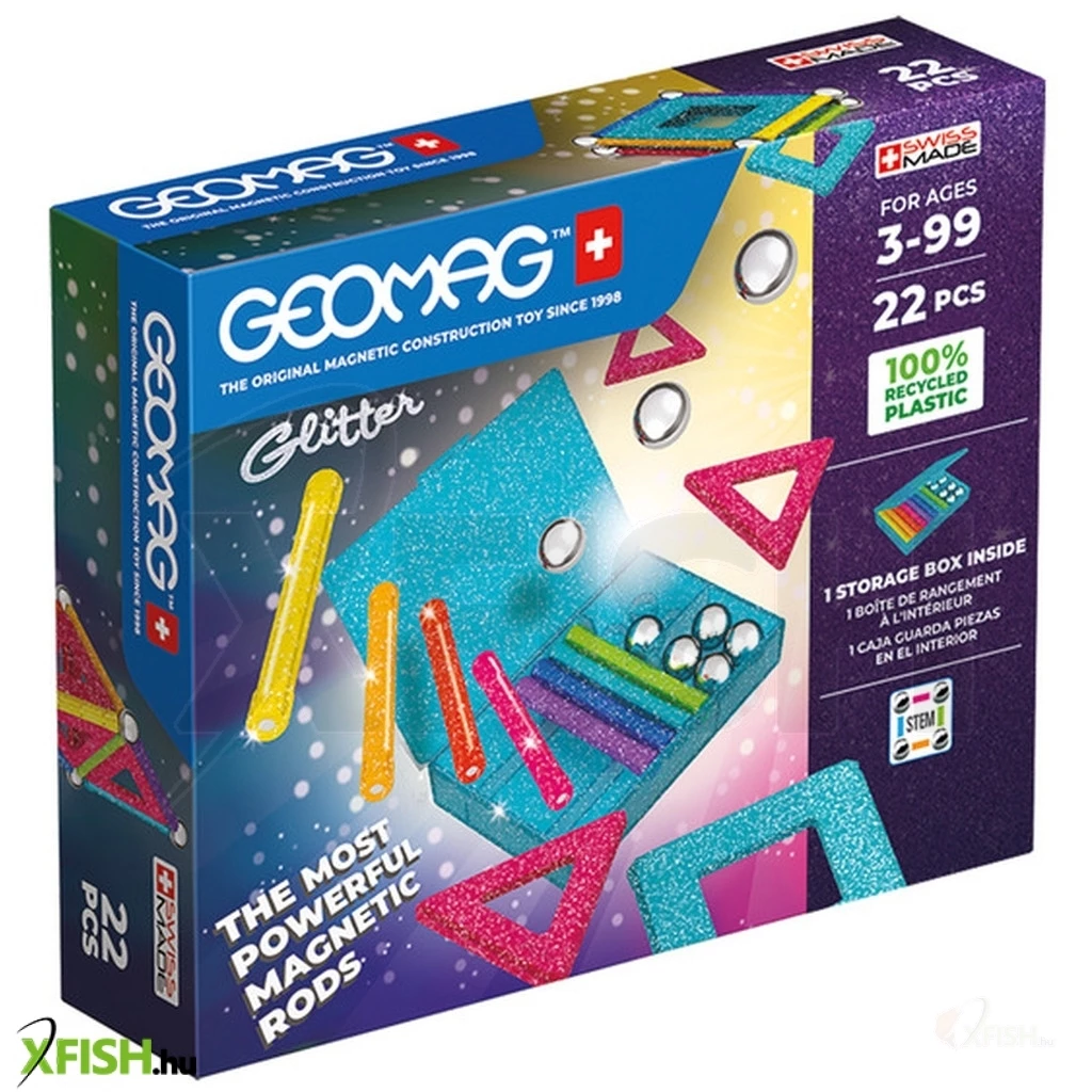 Itt a csillogó Geomag Glitter 22 db-os mágneses építőjáték szett! Káprázatos alakzatokat hozhatsz létre a legújabb csillogós Geomag Glitter 22 db szettből. A készletben található mágneses rudak nemcsak színesek, de csillognak is, így Geomag műved igazán különleges lesz! A csillogás leginkább a lányok világa, de egy fiús építményt is remekül fel tud dobni néhány csillogó alkotóelem. Építési ötletekért használd a mellékelt útmutatót, de még jobb, ha saját fantáziádat hívod segítségül Geomag-alkotásod létrehozatalához! Mit tartalmaz a Geomag Glitter 22 db csillogós mágneses építőjáték szett- 8 db különböző színű csillogó mágneses rúd, 8 db fémgolyó, 4 db háromszögletű műanyag panel, 2 db négyszögletű műanyag panel. Mi a Geomag- A Geomag egy svájci minőségű mágneses építőjáték-család, mely számos termékvariációban érhető el.