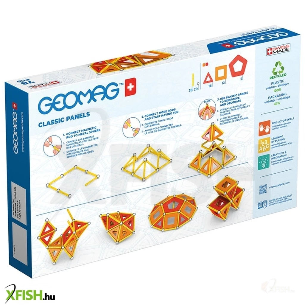 Gondolkodj és építs lenyűgöző alakzatokat! A Geomag Classic Panel narancs, citromsárga és piros színével fogja beindítani a kobakokat! A játék során a mágneses rudakkal, acélgömbökkel és a különböző alakzatú panelekkel leszel képes épületeket és formákat alkotni. A mágnesesség hatására a részek összekapcsolódnak, így egyre gyorsabban leszel képes haladni munkálataid során. A játék 100%-ban újrahasznosított műanyagból készül, emellett az elkészítéséhez megújuló energiaforrásokat használnak, így a nagy építkezések során a gyermekek a környezettudatosságról is tanulhatnak. Használd kreativitásod és térlátásod, hogy különböző alakzatokat és fantasztikus építményeket hozhass létre akár szobád padlóján vagy egy asztalnál üldögélve! A Geomag Classic Panel 78 db elemből készlet tartalmazza a mágneses rudakat, acél gömböket és a három-, négy-, ötszögű paneleket. Az építőjátékot 6 éves kortól ajánljuk.